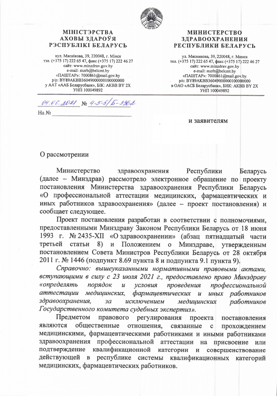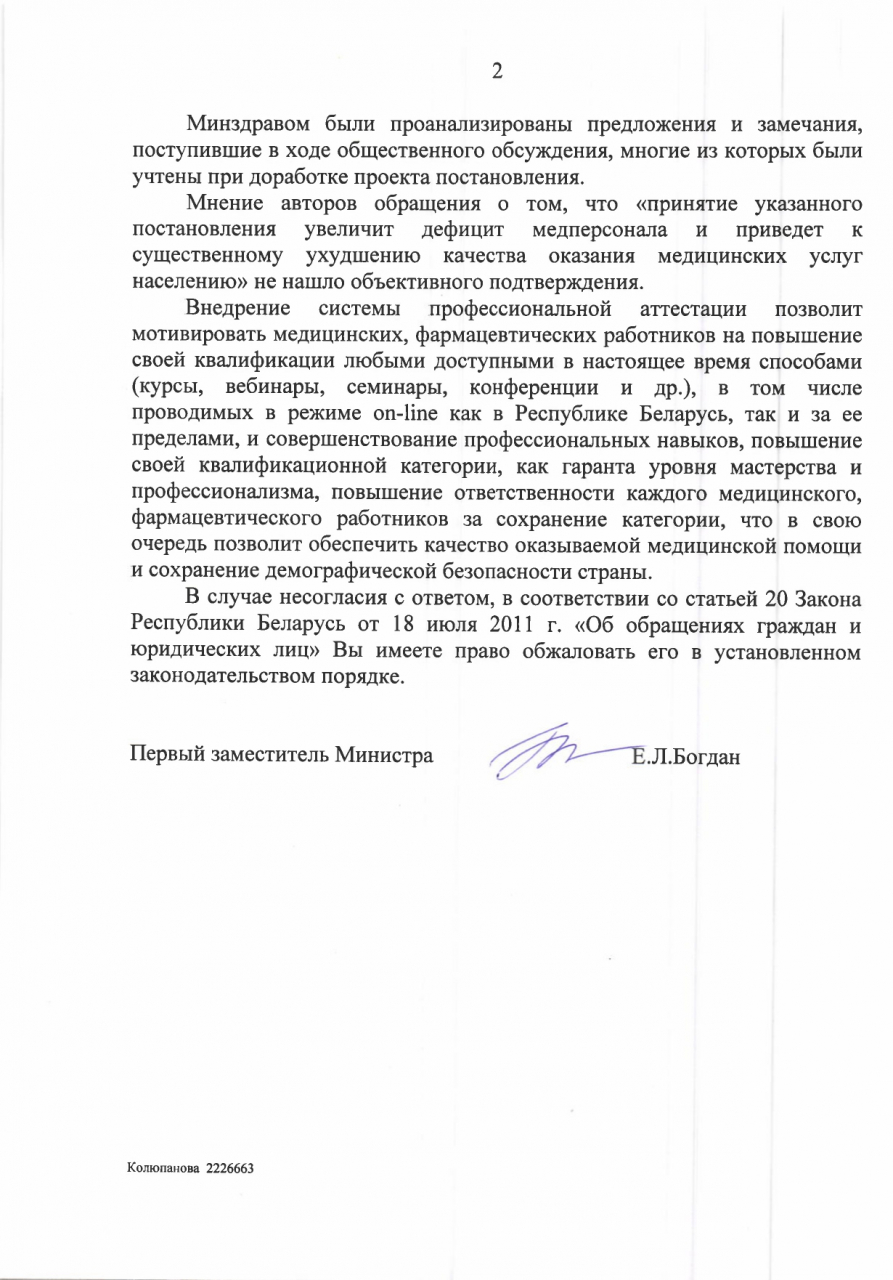 Таким образом, требуем не принимать постановление Минздрава «О профессиональной аттестации медицинских, фармацевтических и иных работников здравоохранения», проект которого сейчас предлагается к обсуждению.