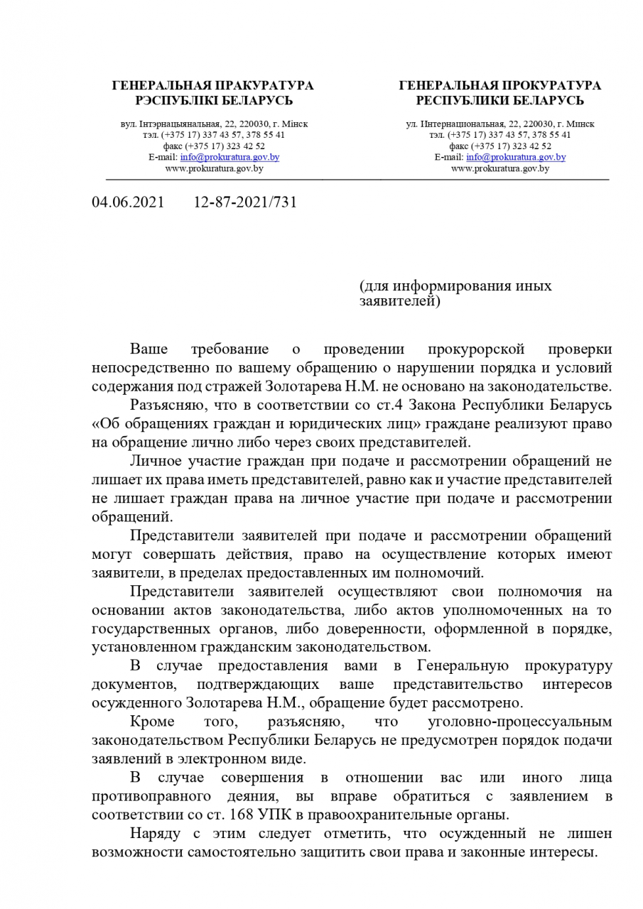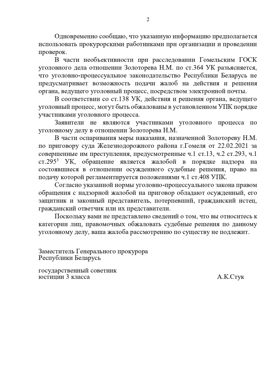 Мы усматриваем в этой информации нарушение принципов и положений уголовного законодательства Республики Беларусь и законодательства о правах ребенка, причинение ущерба личности несовершеннолетнего и посягательство на его безопасность, причинение физических страданий и психического ущерба, унижение человеческого достоинства несовершеннолетнего Золоторёва Н.М. (причинение страданий и ущерба через лишение общения и социальной поддержки, родительской поддержки, посредством устрашения, лишение возможности удовлетворения физиологических, базовых нужд и потребностей и пр.).
