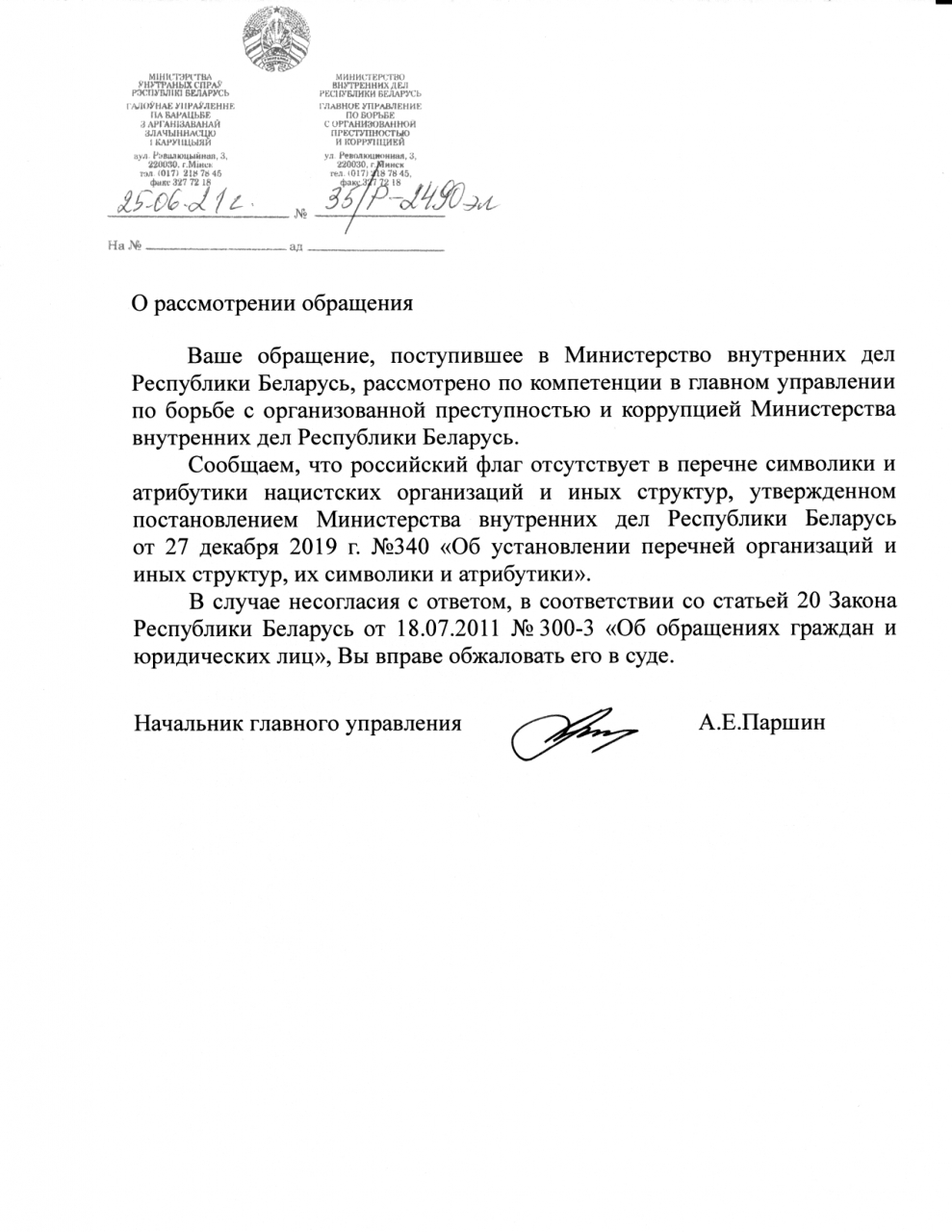- какие меры будут приняты компетентными органами после вступления в силу Закона «О недопущении реабилитации нацизма» для недопущения публичного демонстрирования флага Российской Федерации, как символики, использовавшейся военной организации, сотрудничавшей с фашистскими структурами на оккупированной территории СССР в годы Второй мировой войны, учитывая, что подобные флаги публично демонстрируются на некоторых объектах, например, посольстве Российской Федерации в Беларуси;