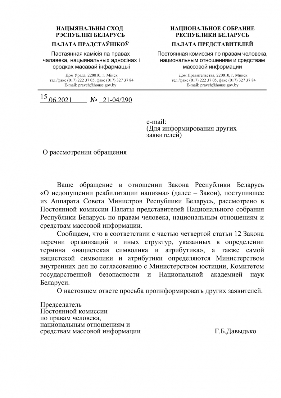 На основании изложенного, учитывая, что ст.16 Закона «О недопущении реабилитации нацизма» определяет, что Совет Министров Республики Беларусь после вступления Закона в силу обязан в месячный срок принять меры по реализации его положений, просим пояснить: