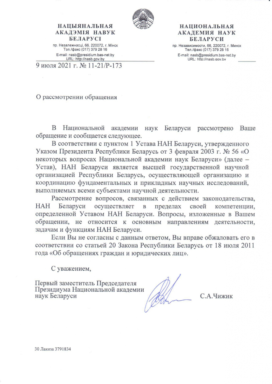 Вопросы, изложенные в обращении, не относятся к основным направлениям деятельности, задачам и функциям НАН Беларуси.