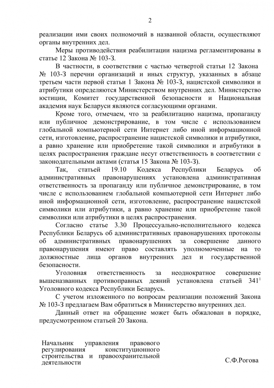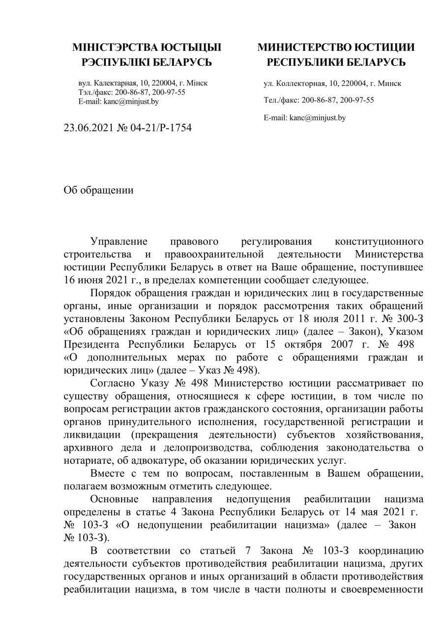 По вопросам реализации положений Закона №103-З «О недопущении реабилитации нацизма» Минюст предлагает заявителям обратиться в Министерство внутренних дел.