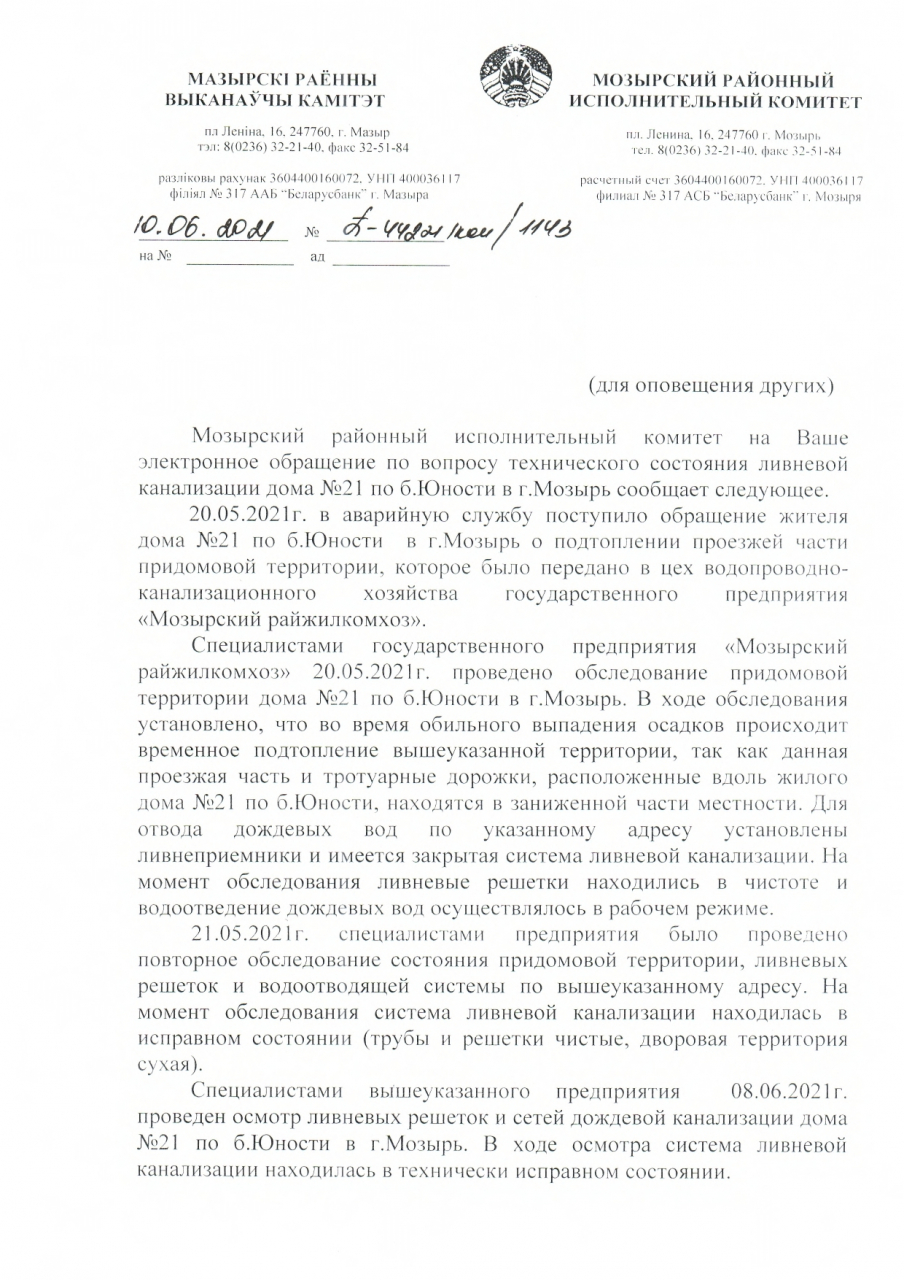 - произвести работы по приведению в технически исправное состояние ливневую канализацию, расположенную на придомовой территории жилого дома №21 по бульвару Юности в г.Мозырь, а также близ расположенных к нему домах №5,9,13;