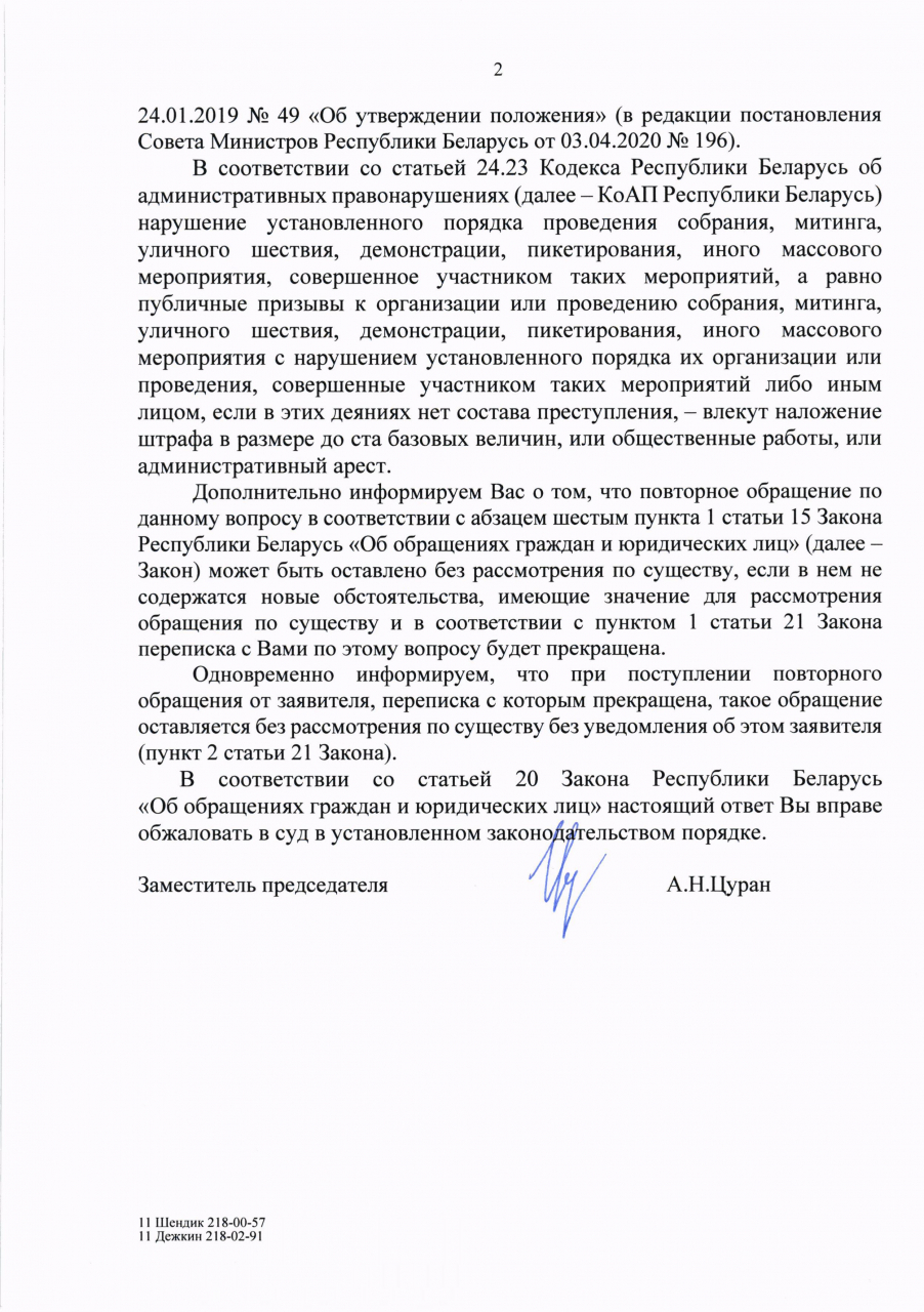 Нарушение установленного порядка проведения собрания, митинга, уличного шествия, демонстрации, пикетирования, иного массового мероприятия, совершенное участником таких мероприятий, а равно публичные призывы к организации или проведению собрания, митинга, уличного шествия, демонстрации, пикетирования, иного массового мероприятия с нарушением установленного порядка их организации или проведения, совершенные участником таких мероприятий либо иным лицом, – влекут наложение штрафа в размере до ста базовых величин, или общественные работы, или административный арест.