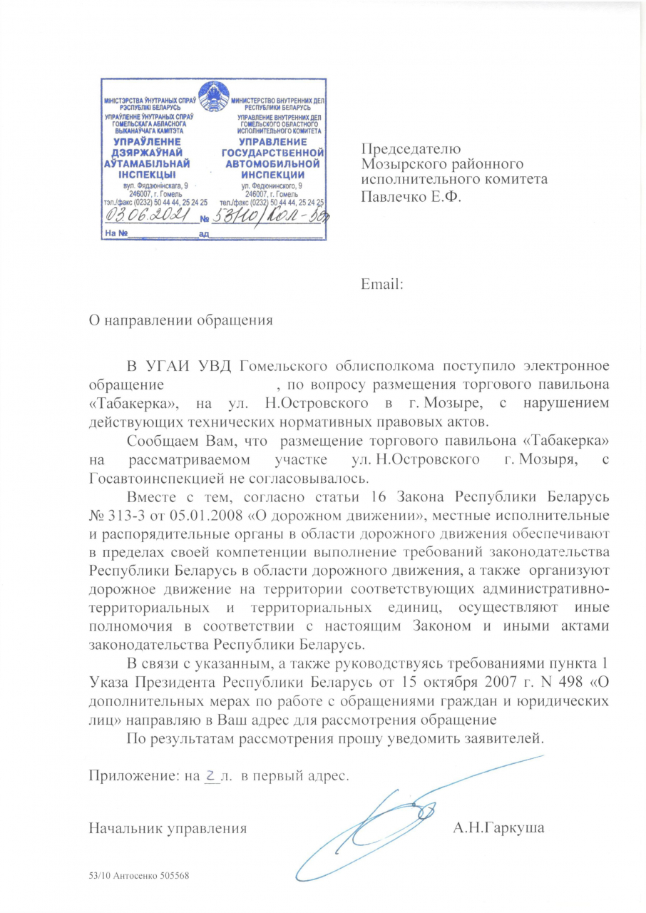 Размещение торгового павильона "Табакерка" на рассматриваемом участке на ул.Н.Островского г.Мозыря с Госавтоинспекцией не согласовывалось.