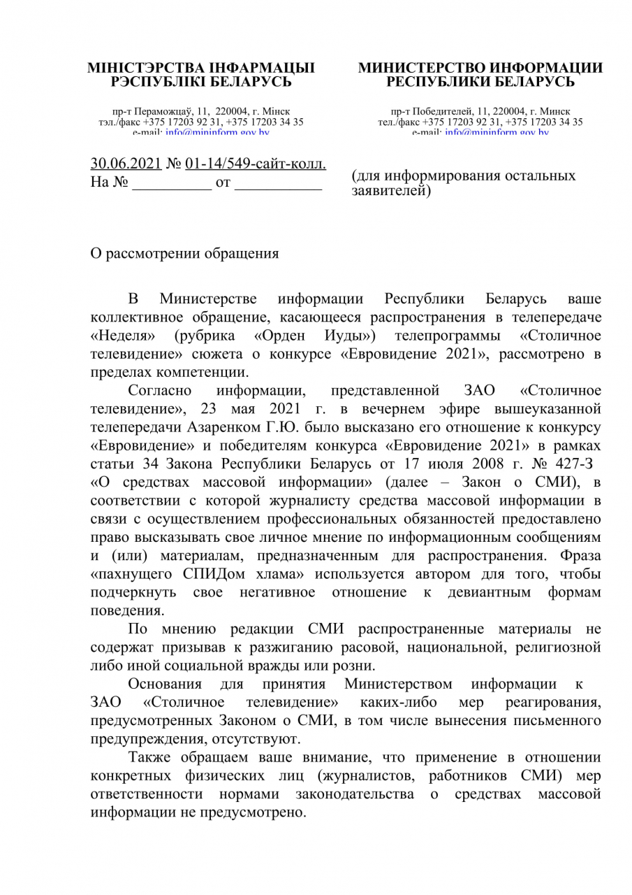 В выпуске программы «Неделя», выходящей на телеканале «СТВ», в рубрике «Орден Иуды» корреспондент Г.Азарёнок допустил следующее высказывание, говоря об участниках конкурса песни «Евровидение – 2021»: «Посмотрите, что вчера выиграло на «Евровидении». Это - бестиарий извращенцев, голубых дегенератов, пахнущего СПИДом хлама! Слава богу, что в Беларуси это не показывали!».