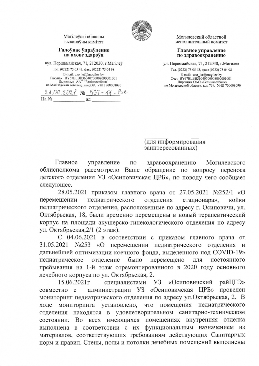 Настоящим обращением просим перенести детское отделение УЗ "Осиповичская центральная районная больница" в новый корпус Осиповичской районной больницы.