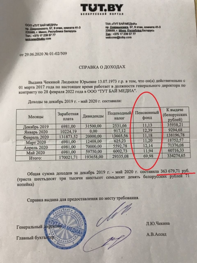 Однако, если внимательно ознакомиться со справкой о доходах Людмилы Чекиной, демонстрируемой в той же программе "СТВ", то подоходного налога директор ООО "ТУТ БАЙ МЕДИА" заплатила в сумме 29 335 рублей 08 копеек. А упомянутые Г.Азарёнком "70 рублей" Людмила Чекина заплатила в пенсионный фонд!