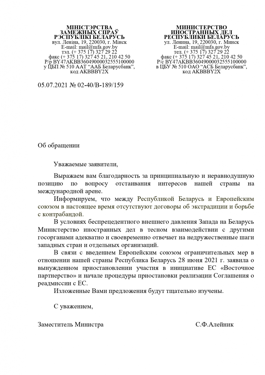 Мы - граждане Республики Беларусь - просим рассмотреть возможность выхода из договоров между Республикой Беларусь и Европейским Союзом в части экстрадиции и борьбы с контрабандой.