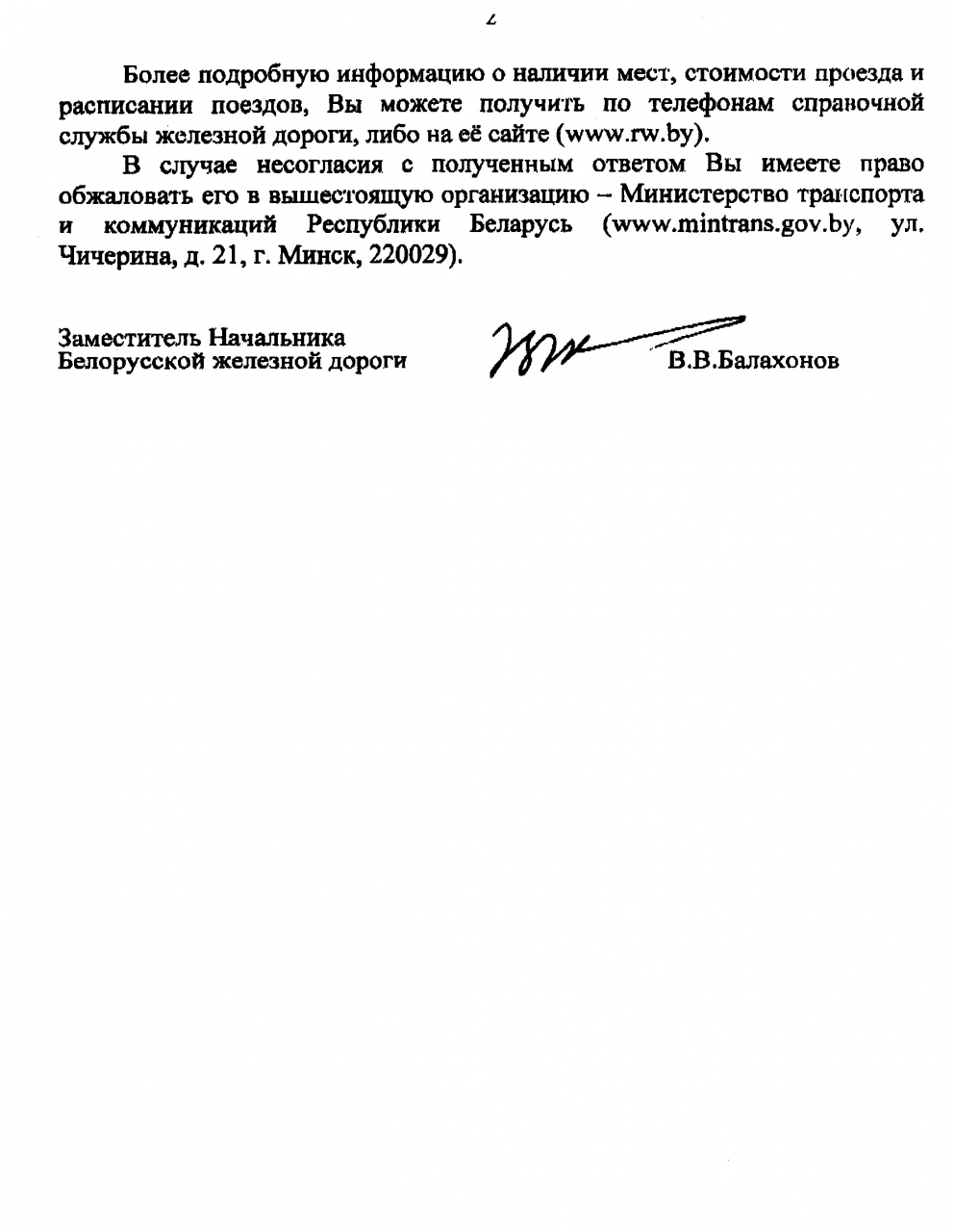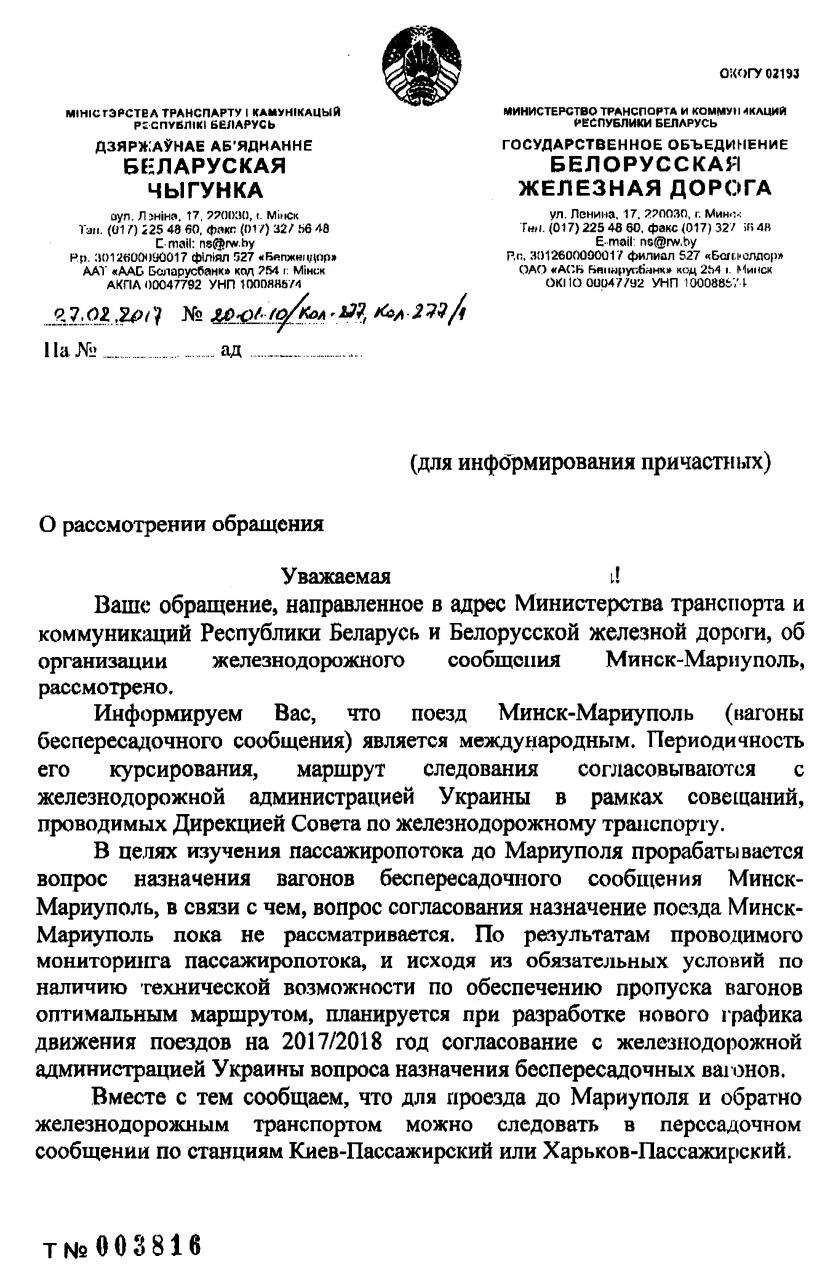 Просим вернуть в обращение поезд в сообщении с г. Мариуполем по его первоначальному маршруту с отправлением из Минска.