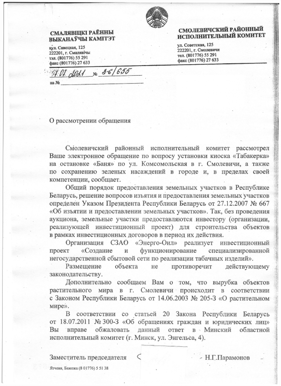 Размещение объекта по реализации табачных изделий не противоречит действующему законодательству. Вырубка объектов растительного мира в г.Смолевичи происходит в соответствии с Законом "О растительном мире".