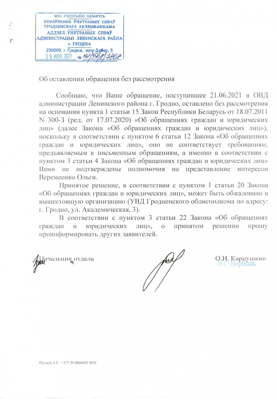 03 июня 2021 г. стало известно из средств массовой информации, что сотрудники ОМОН пришли по адресу улица Кирова, 3, около 17.00 того же дня, также прибыли сотрудники Ленинского РОВД г.Гродно. В отношении Ольги Веремеенко, владельца магазина «Адметнасць», начали административный процесс по ст. 24.23 КоАП за «пикетирование».
