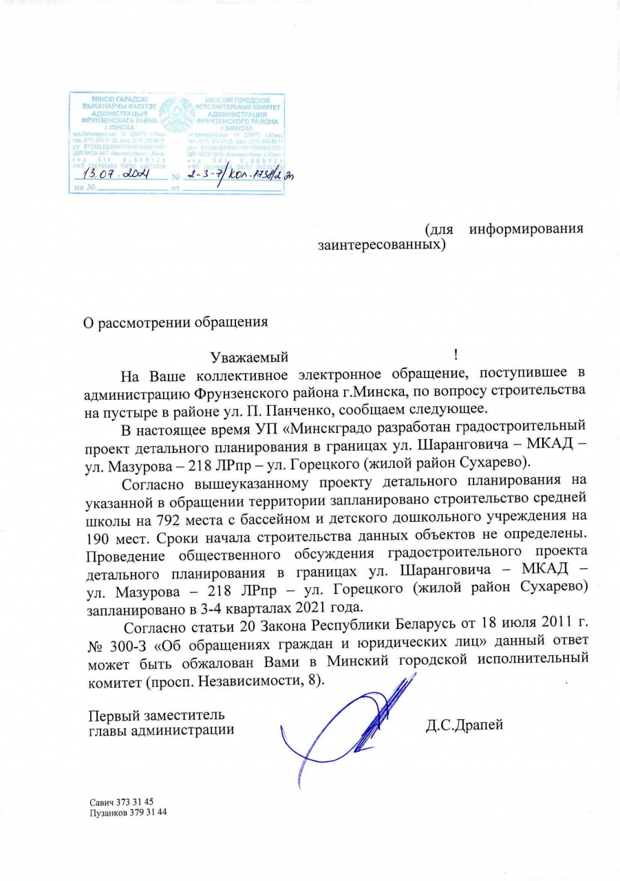 Уважаемый глава администрации Фрунзенского района г. Минска Шкруднев Сергей Анатольевич.
