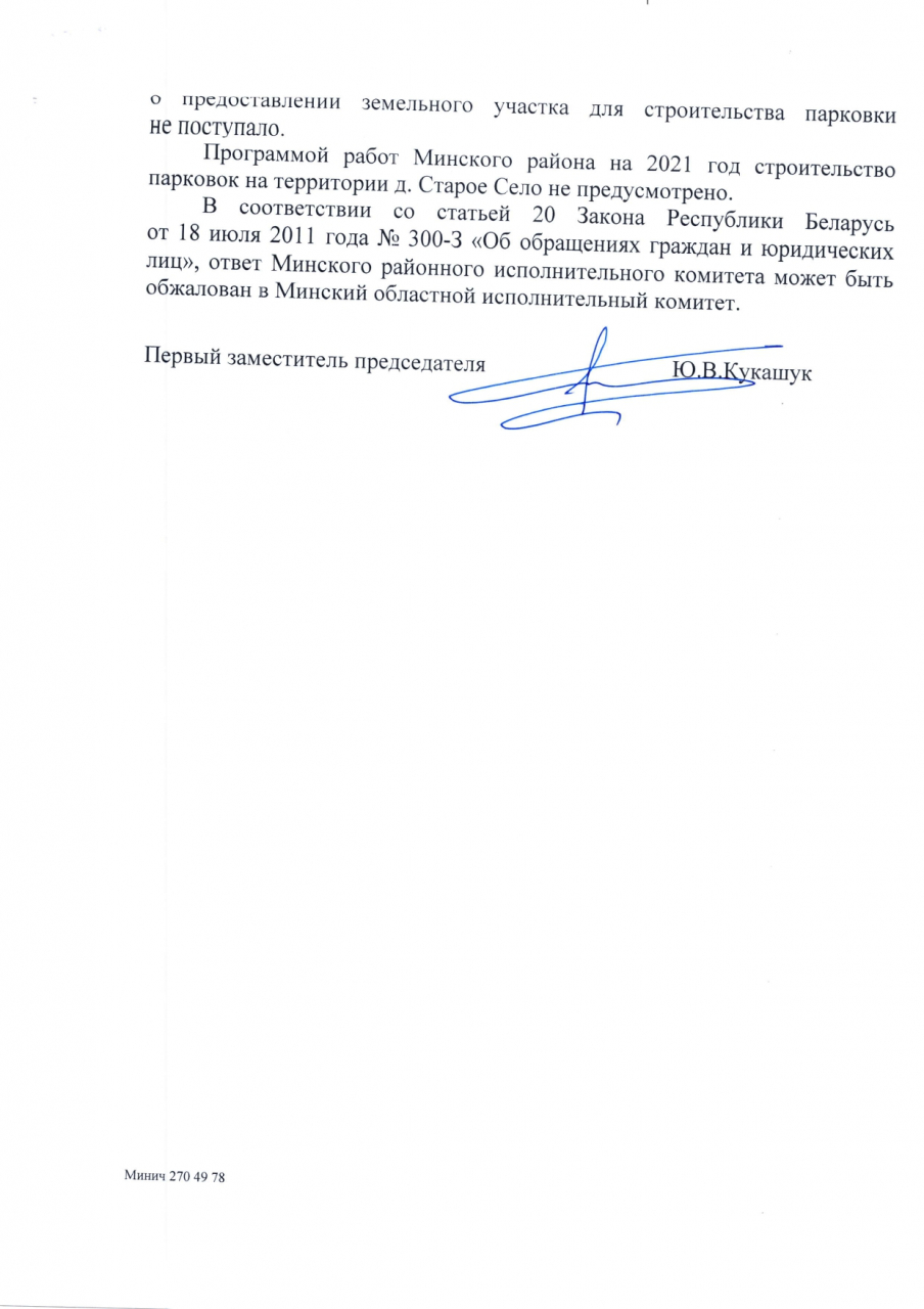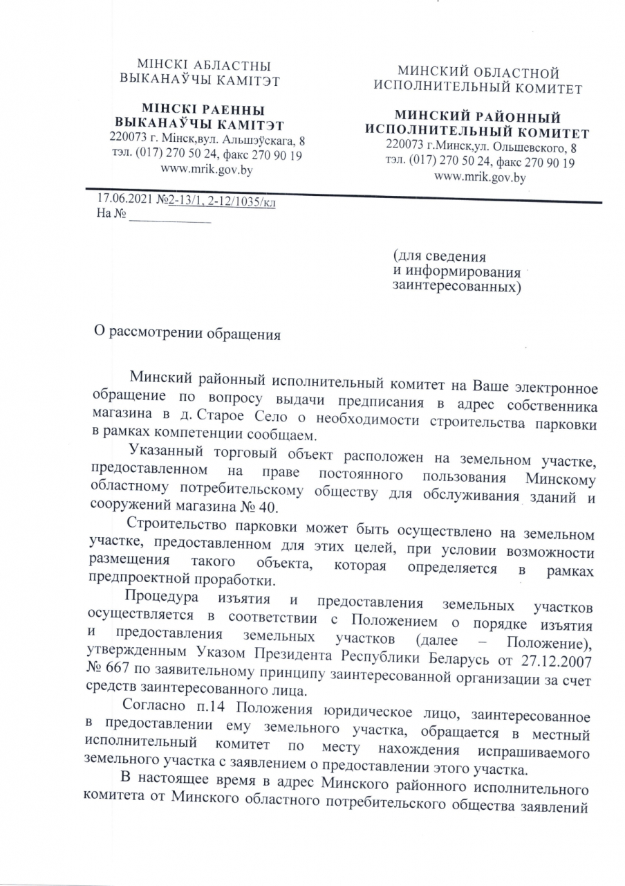 В адрес Минского райисполкома от Минского облпотребобщества, которому на праве постоянного пользования принадлежит земельный участок, где находится магазин, заявлений о предоставлении земельного участка для строительства парковки не поступало.
