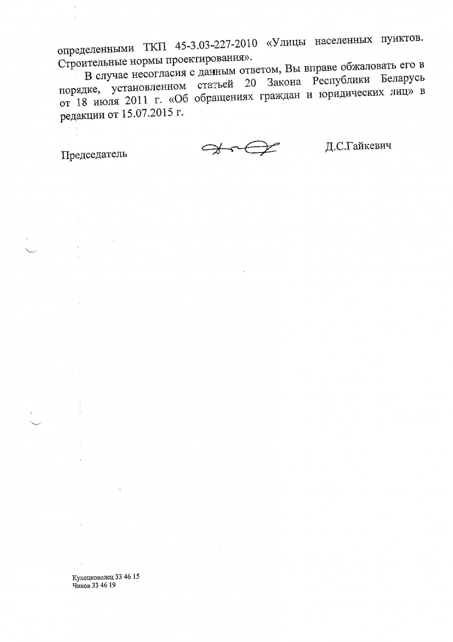 2. В то же время управляющий делами райисполкома Чигер А.С. проигнорировал упомянутый в изначальном обращении ТКП 507-2014 (02190) "Автомобильные дороги. Размещение и обустройство объектов сервиса".