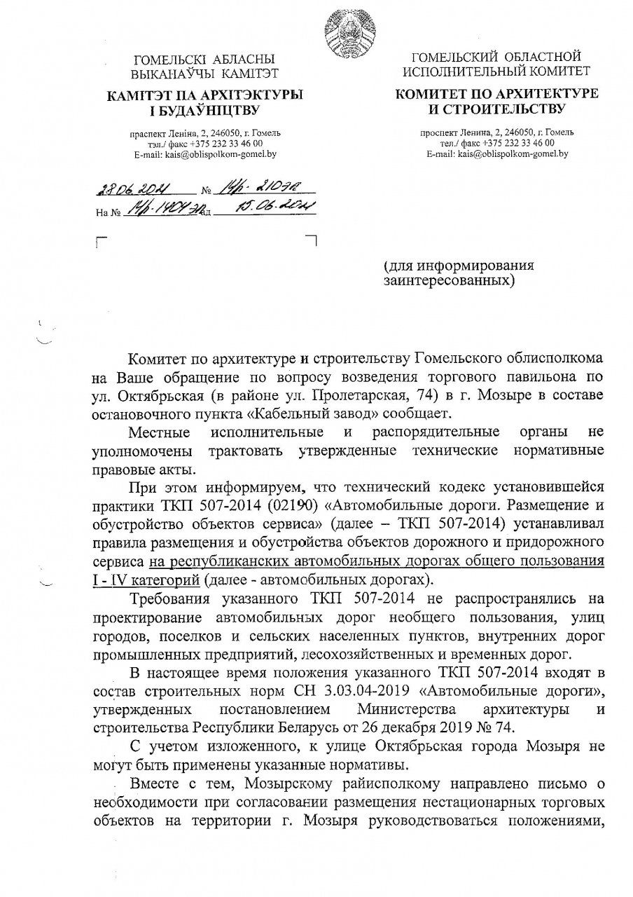 Мозырскому райисполкому направлено письмо о необходимости при согласовании размещения нестационарных торговых объектов на территории г. Мозыря руководствоваться положениями, определенными ТКП 45-3.03-227-2010 «Улицы населенных пунктов. Строительные нормы проектирования».
