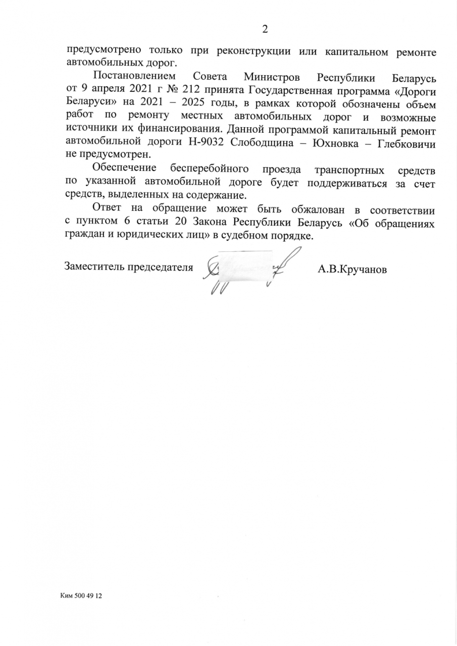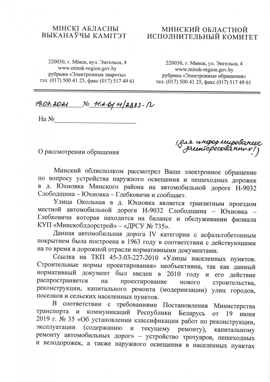 08 июня 2021 г. получен ответ КУП «Минскоблдорстрой» (копия прилагается) на коллективное электронное обращение с требованием установки осветительных мачт и создании безопасной пешеходной дорожки в д.Юхновка, Минского района (Колодищанский с/с).