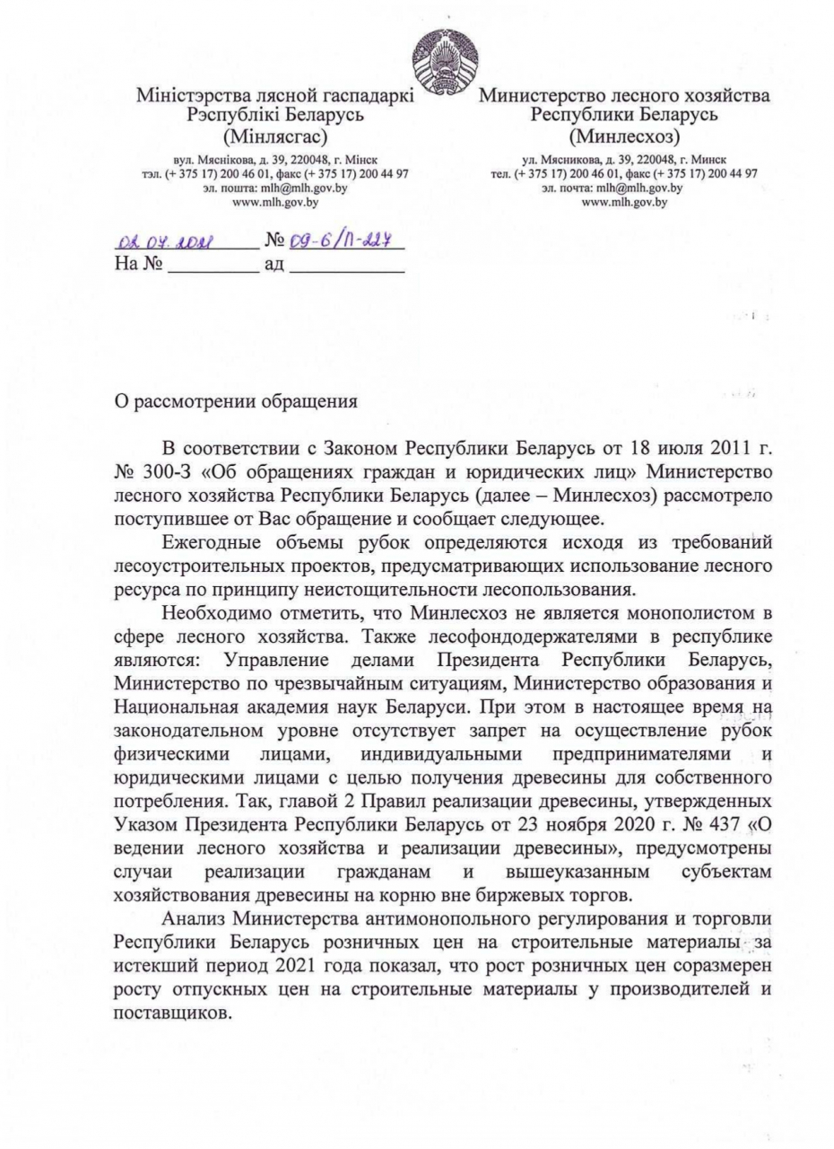 Настоящим обращением просим пересмотреть правила по вырубке и реализации леса на территории Республики Беларусь с целью продажи на внутренний рынок.