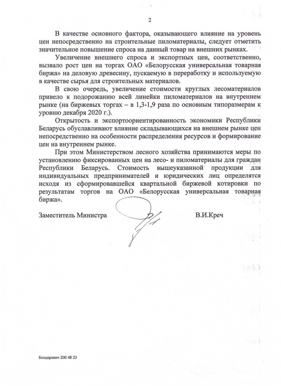 Минлесхозом принимаются меры по установлению фиксированных цен на лесо- и пиломатериалы для граждан Республики Беларусь. Стоимость указанной продукции для ИП и юридических лиц определятся, исходя из сформировавшейся квартальной биржевой котировки по результатам торгов на ОАО "Белорусская универсальная товарная биржа".