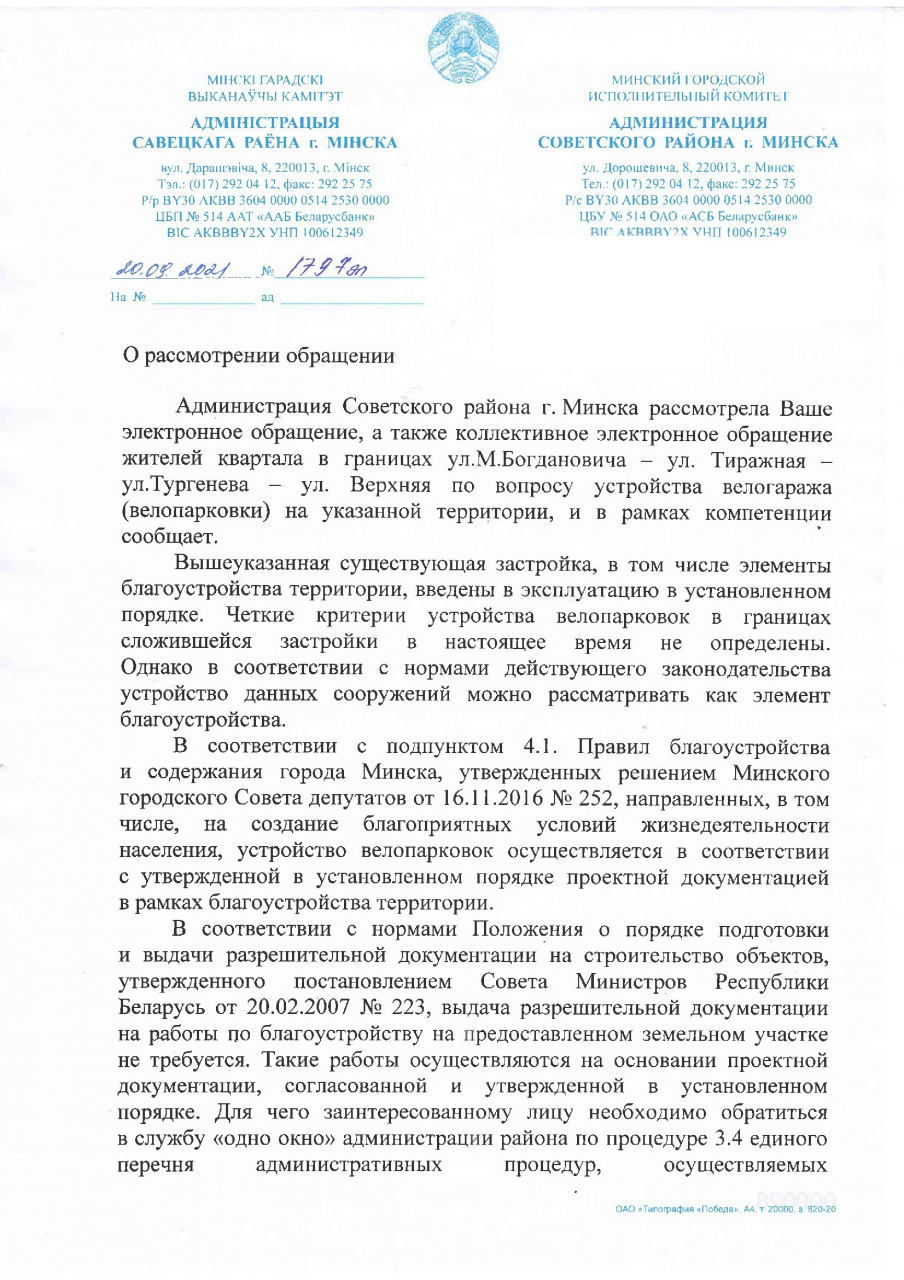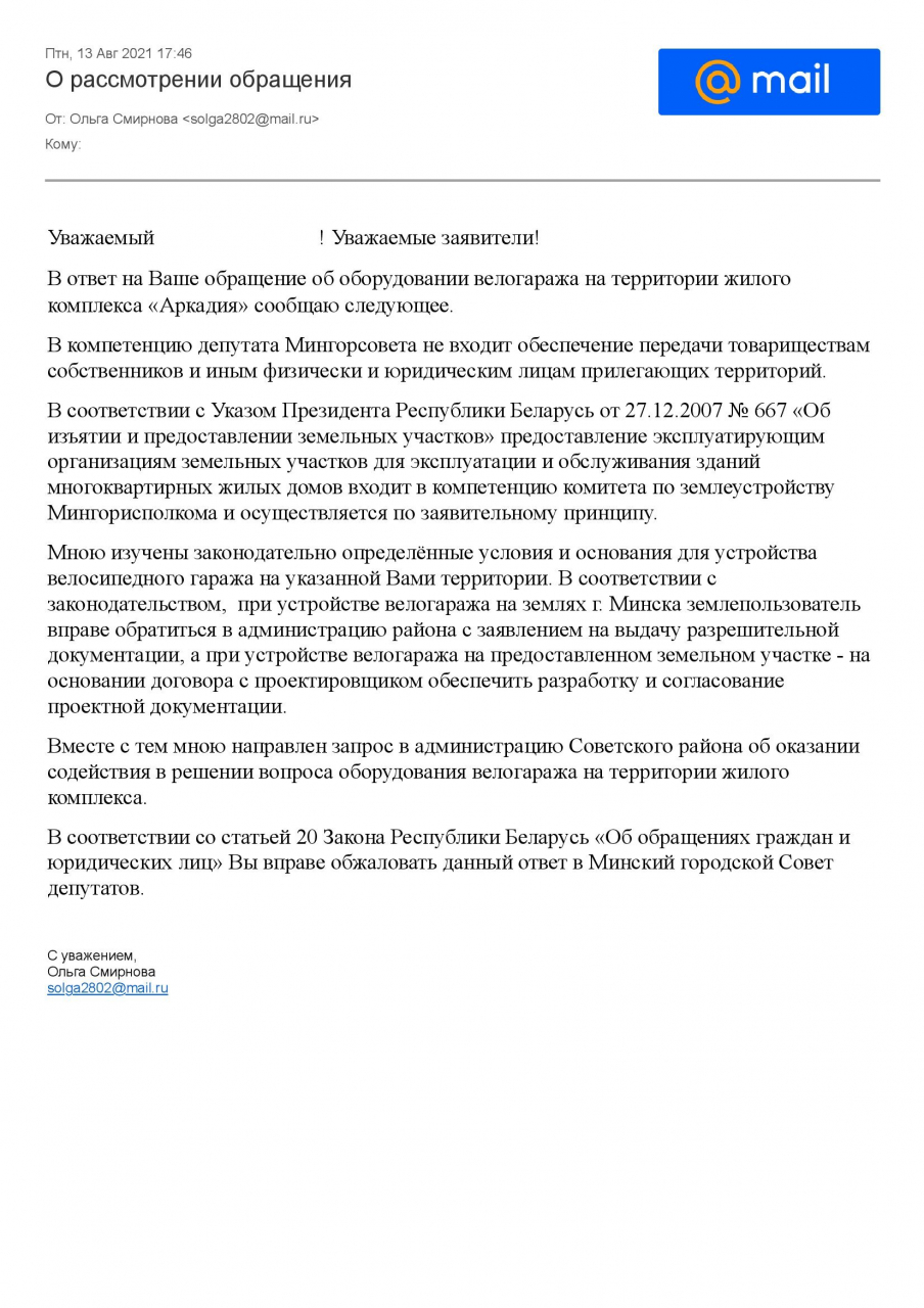 Мною направлен запрос в администрацию Советского района об оказании содействия в решении вопроса оборудования велогаража на территории жилого комплекса.