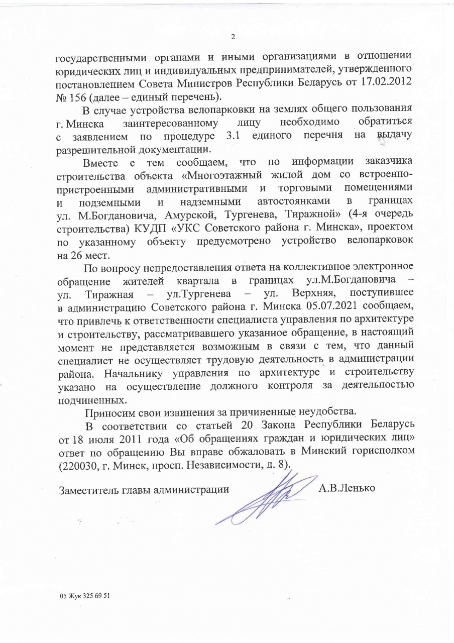 2) По вопросу несвоевременное предоставление ответа на обращение, поступившее 05.07.2021: привлечь к ответственности специалиста, рассматривавшего обращение, не представляется возможным в связи с его увольнением. Начальнику управления по архитектуре и строительству указано на осуществление должного контроля за деятельностью подчиненных.