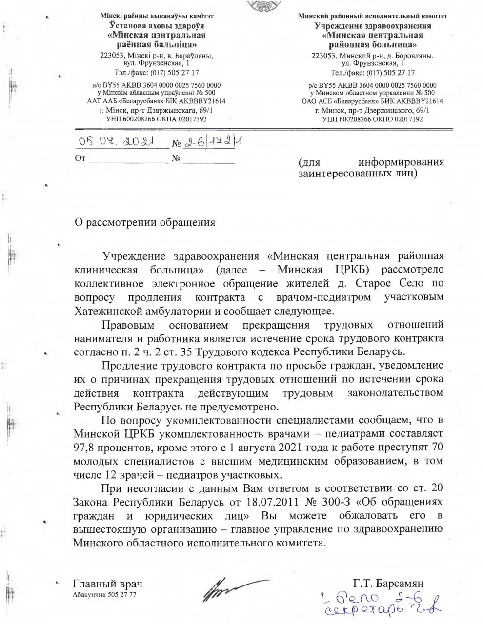 Мы, нижеподписавшиеся жители д.Хатежино, д.Старое Село и близлежащих населенных пунктов, а также иные заинтересованные граждане, сообщаем вам, что нас глубоко тронуло и озадачило непродление контракта с врачом-педиатром нашей амбулатории Чехович Натальей Ярославовной.