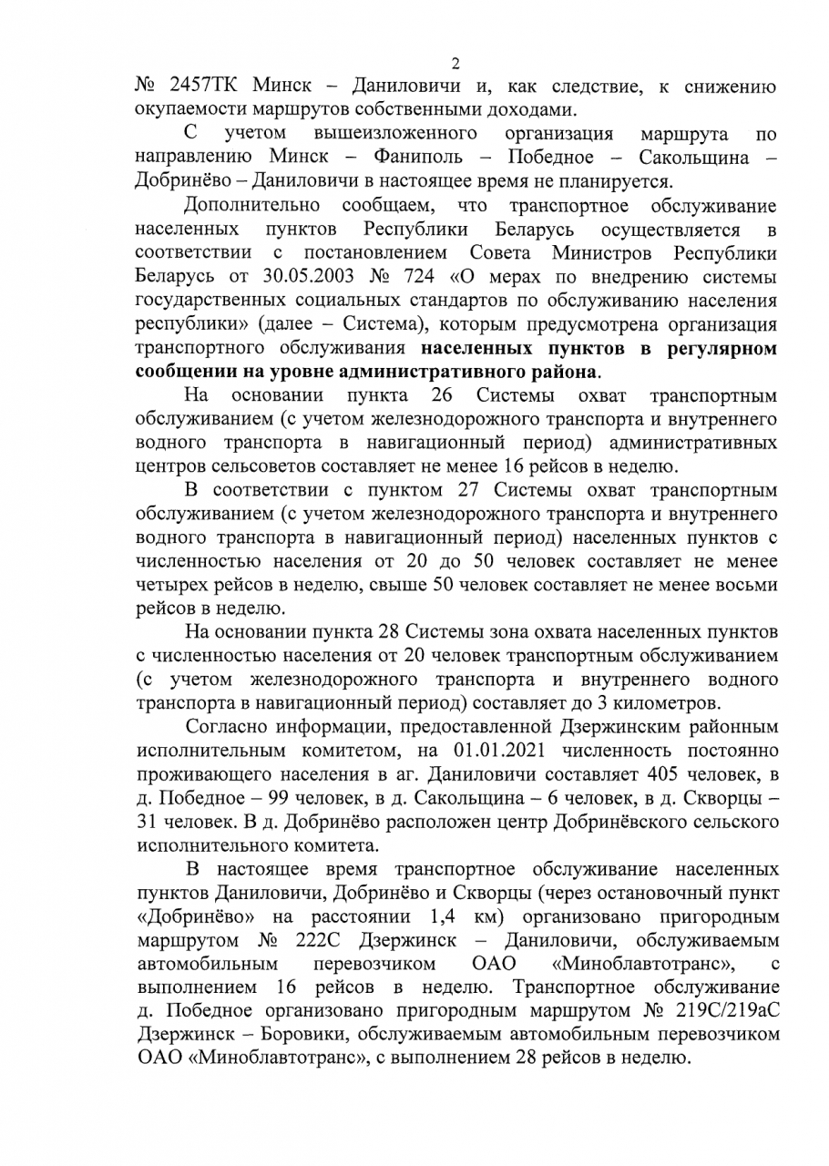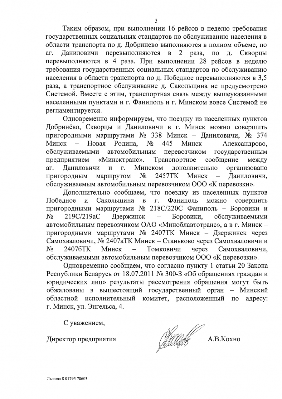 Мы, жители деревень Дзержинского района и иные заинтересованные граждане, подписавшиеся под настоящим обращением, сталкиваемся с рядом проблем, связанных с отсутствием регулярного транспортного сообщения наших населенных пунктов с городами Фаниполь и Минск: