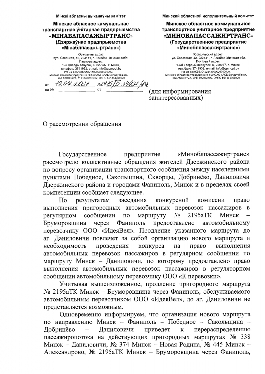 Организация маршрута по направлению Минск-Фаниполь-Победное-Сакольщина-Добринёво-Даниловичи в настоящее время не планируется.