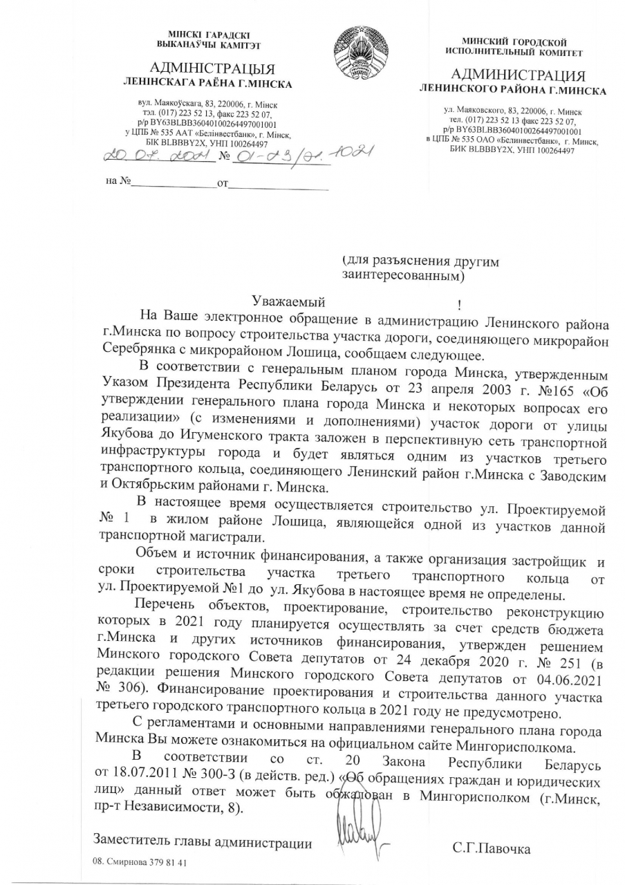 В соответствии с генеральным планом города Минска, утвержденным Указом от 23 апреля 2003 г. №165 участок дороги от улицы Якубова до Игуменского тракта заложен в перспективную сеть транспортной инфраструктуры города и будет являться одним из участков третьего транспортного кольца, соединяющего Ленинский район г.Минска с Заводским и Октябрьским районами г. Минска.