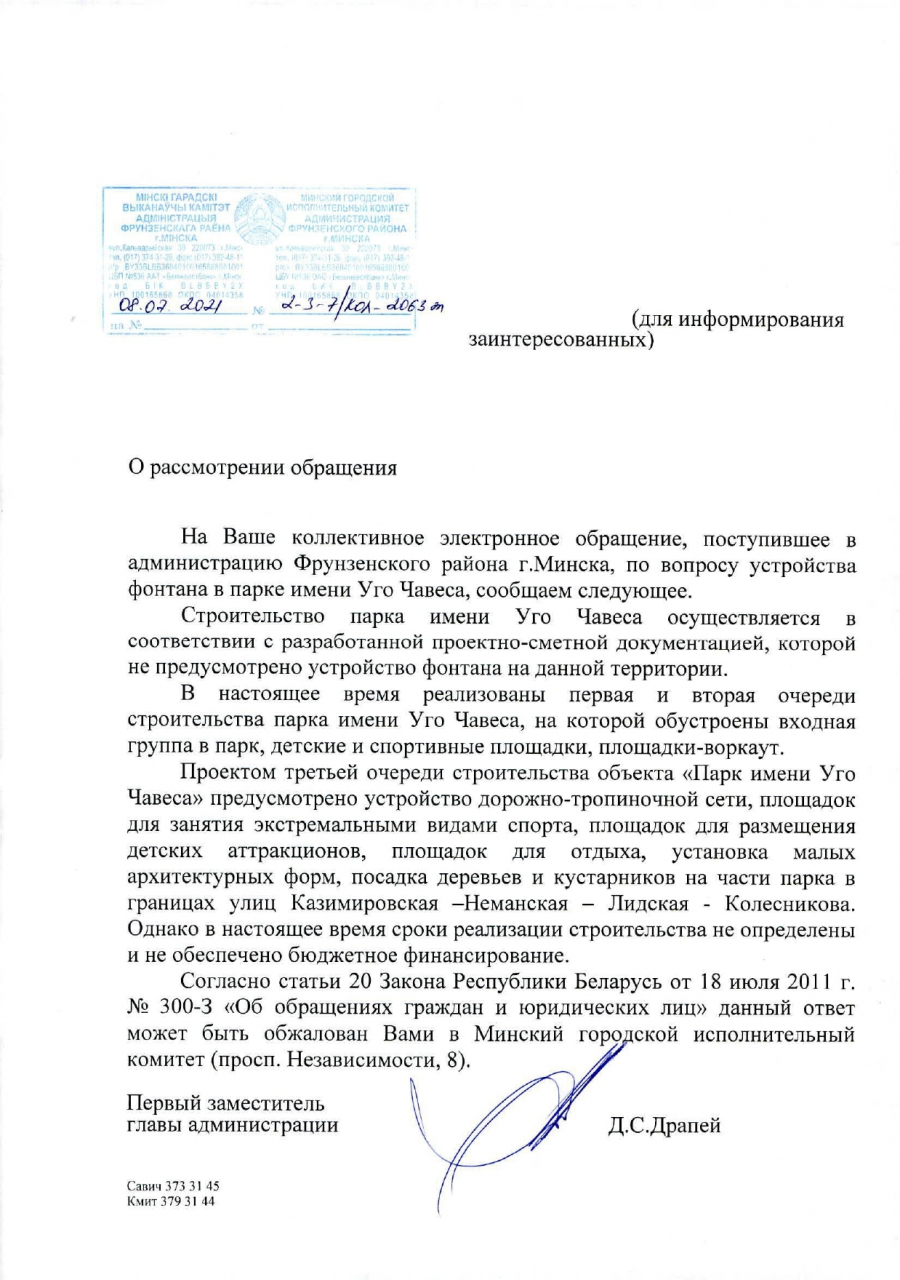 На основании изложенного требуем разместить на территории парка имени Уго Чавеса фонтан.