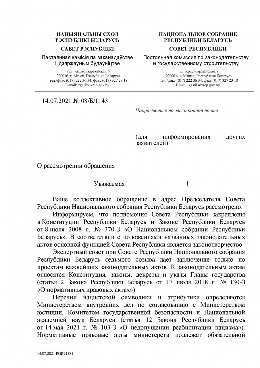 В этой связи обращение направлено для сведения в Совет Республики и Палату представителей Национального собрания Республики Беларусь.