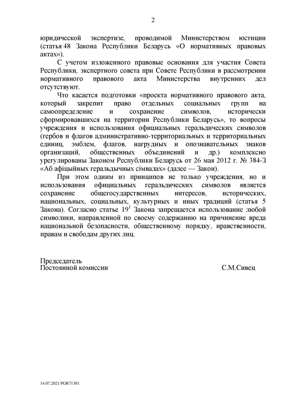В настоящее время вышеназванные государственные органы работают над совершенствованием действующего законодательства, в том числе в части использования определенной символики. При этом учитываются мнения и пожелания населения Беларуси.