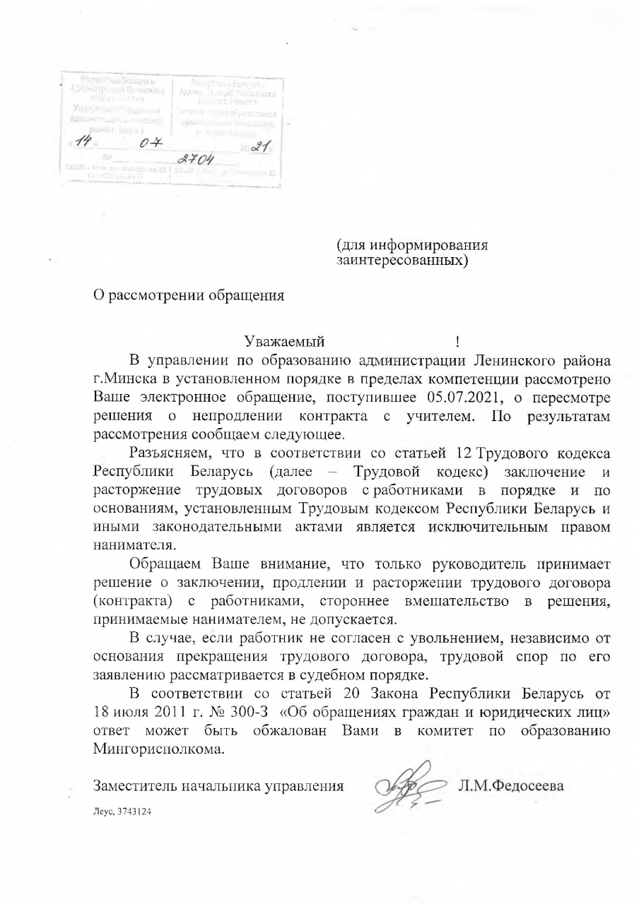 В то время как президент Республики Беларусь говорит, как важно для детей образование, директор школы не продляет трудовой договор педагогу высшей квалификации. Надеемся на понимание проблемы и совместное решение с вами.