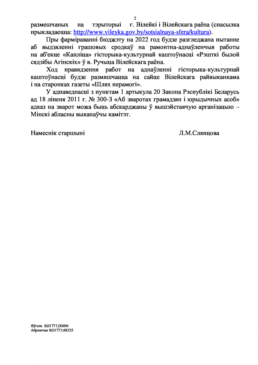 Ход правядзення работ па аднаўленні гісторыка-культурнай каштоўнасці будзе размяшчацца на сайце Вілейскага райвыканкама і на старонках газеты «Шлях перамогі».