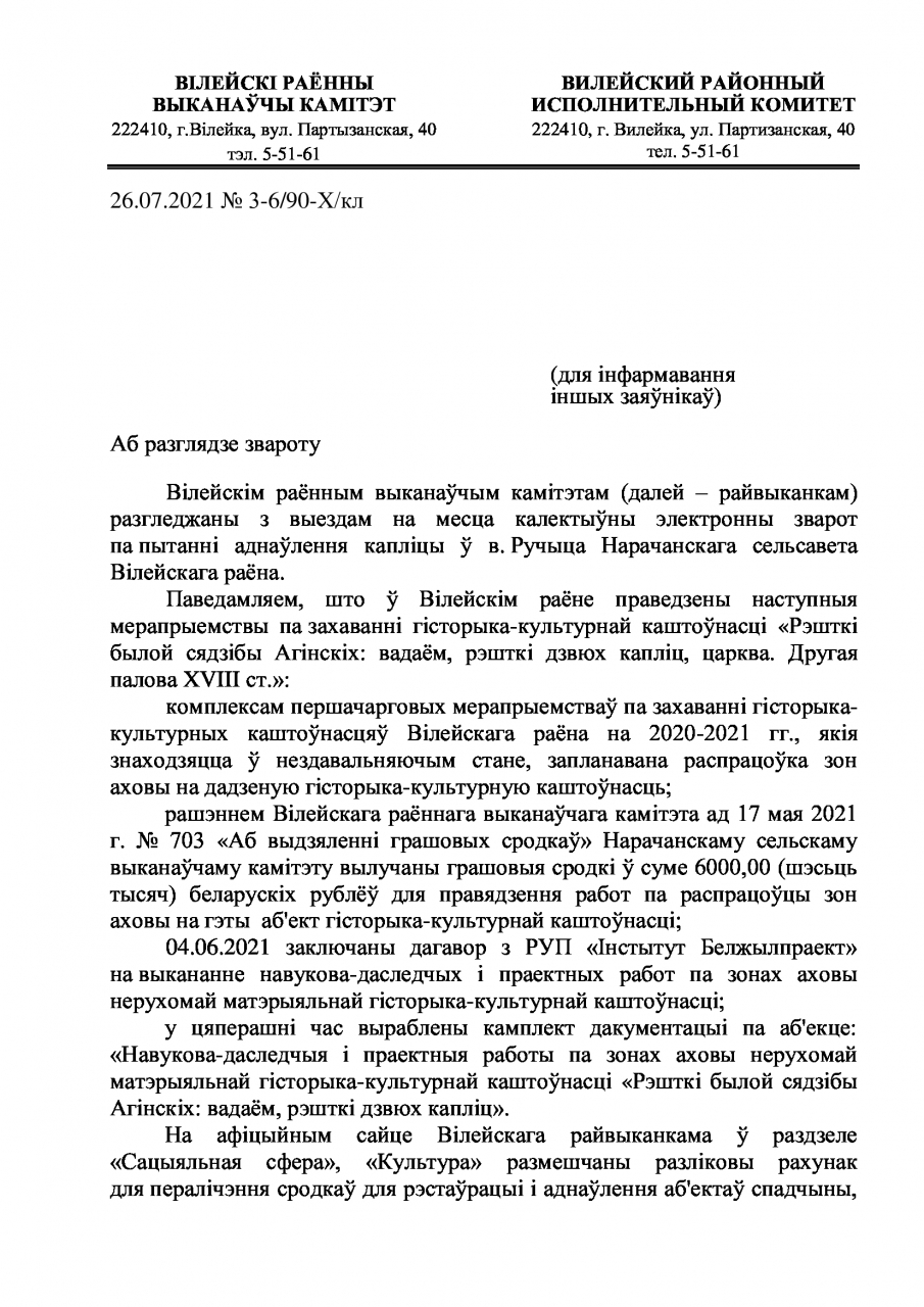 Пры фарміраванні бюджэту на 2022 год будзе разгледжана пытанне аб выдзяленні грашовых сродкаў на рамонтна-аднаўленчыя работы на аб'екце «Капліца» гісторыка-культурнай каштоўнасці «Рэшткі былой сядзібы Агінскіх» ў в. Ручыца Вілейскага раёна.