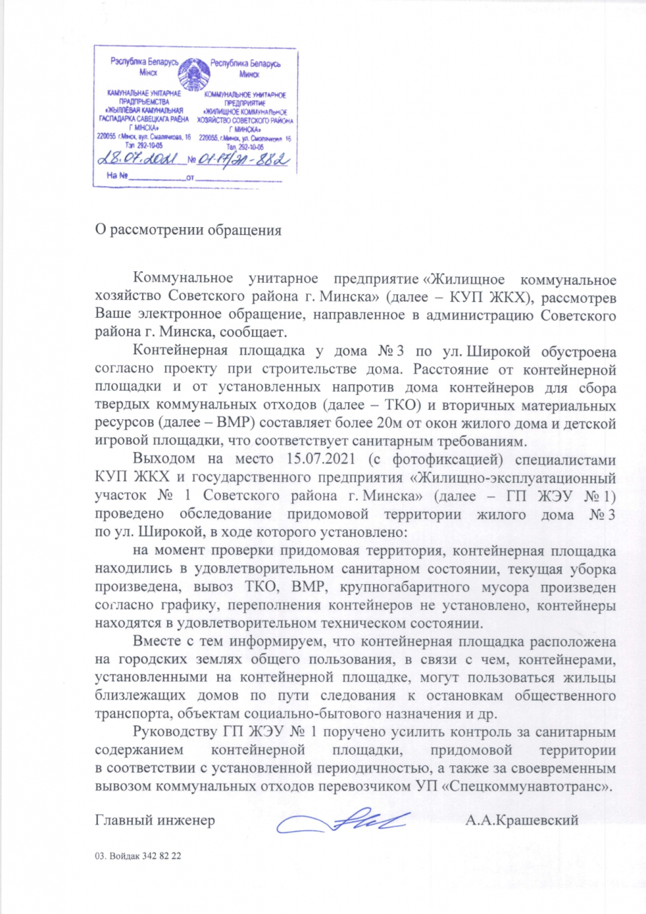 Руководству ГП ЖЭУ №1 поручено усилить контроль за санитарным содержанием контейнерной площадки, придомовой территории в соответствии с установленной периодичностью, а также за своевременным вывозом коммунальных отходов перевозчиком УП "Спецкоммунавтотранс".