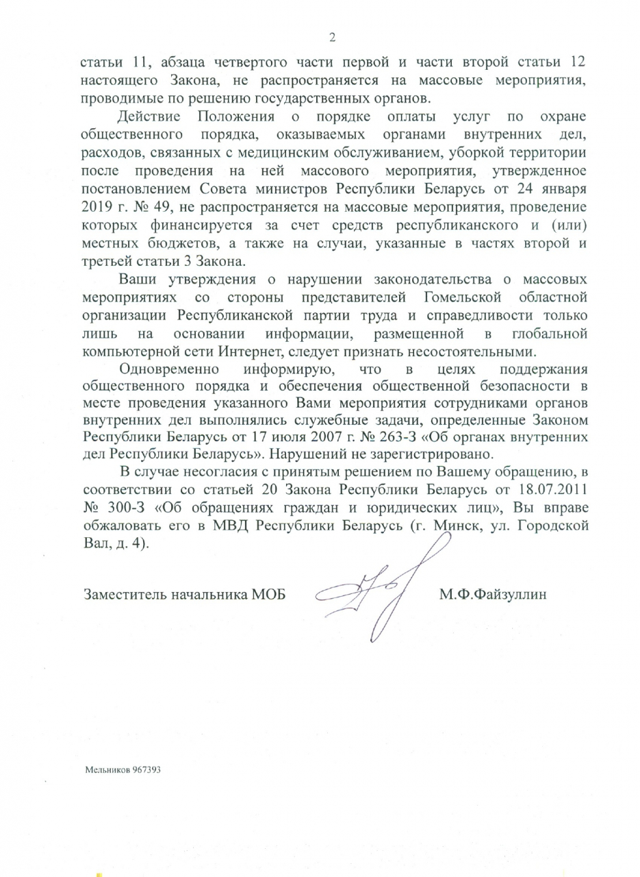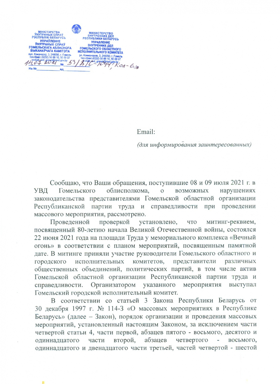 Утверждения заявителей о нарушении законодательства о массовых мероприятиях со стороны представителей Гомельской областной организации Республиканской партии труда и справедливости только на основании информации, размещённой в глобальной компьютерной сети Интернет, признаны несостоятельными.