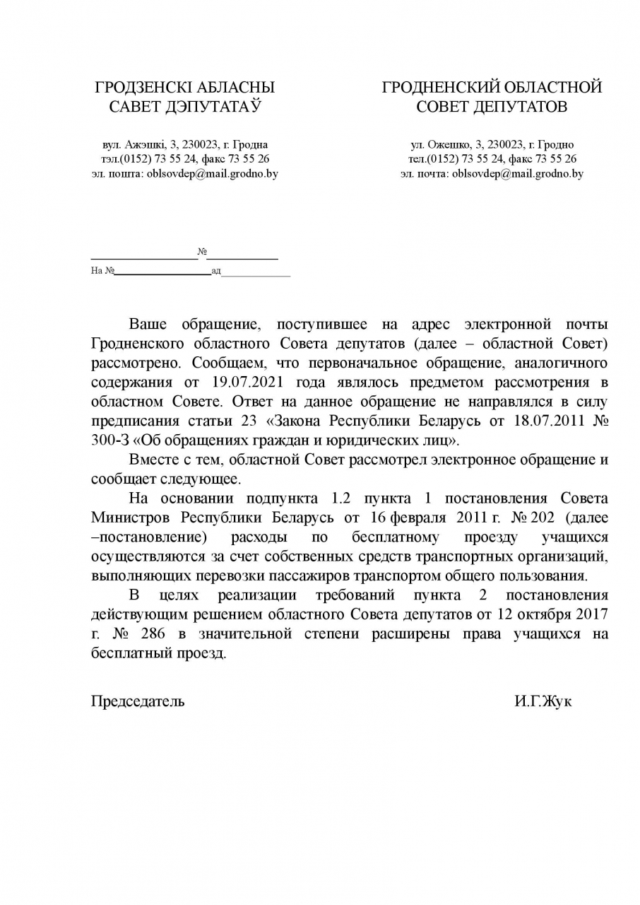- на ближайшей сессии Гродненского областного Совета депутатов внести изменения в решение Гродненского областного Совета депутатов от 12.10.2017 № 286 "О дополнительных мерах по социальной поддержке обучающихся", которые бы позволили обучающимся ездить в общественном транспорте бесплатно в течении всего календарного (а не только учебного) года.