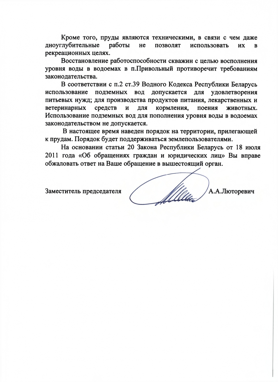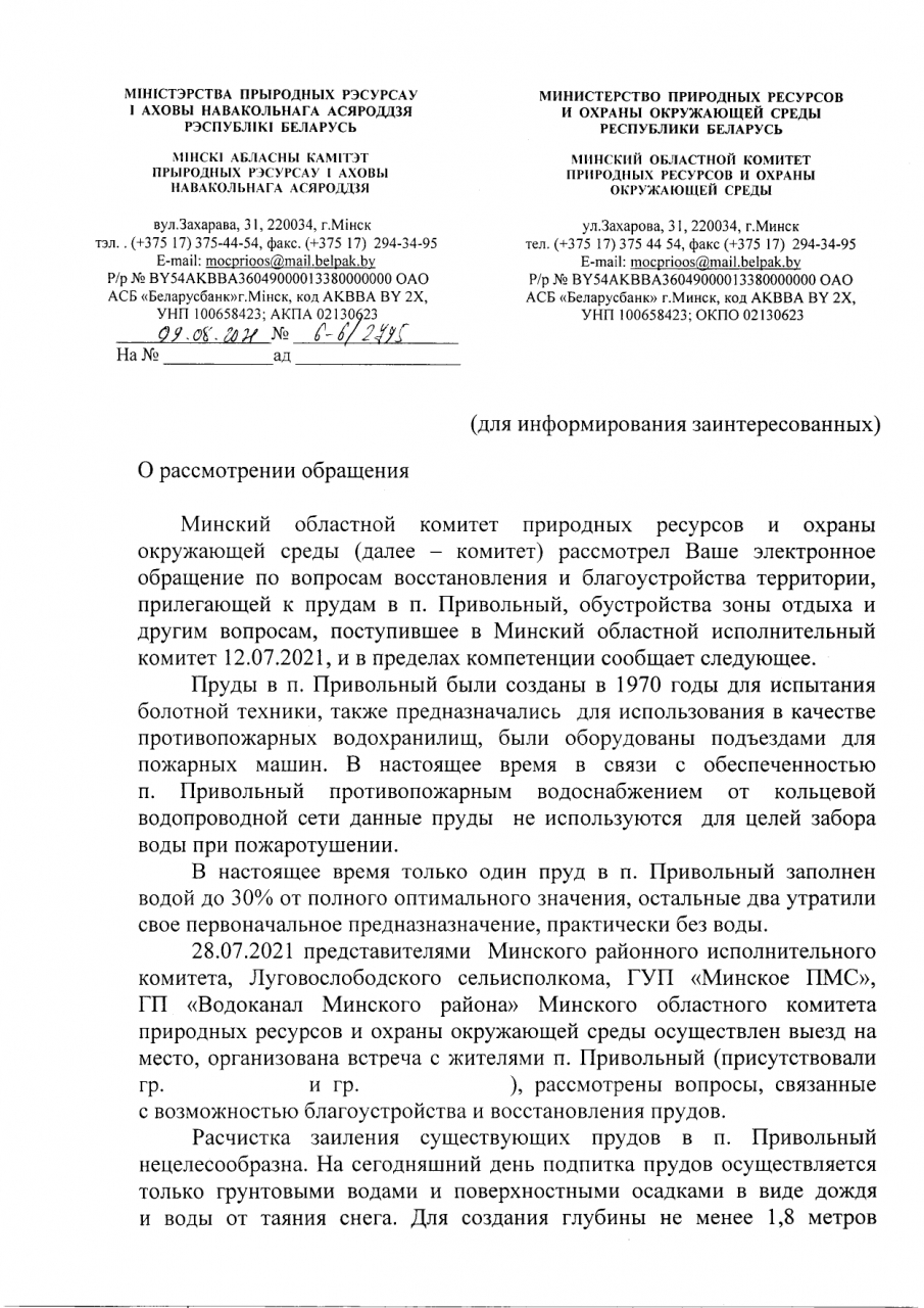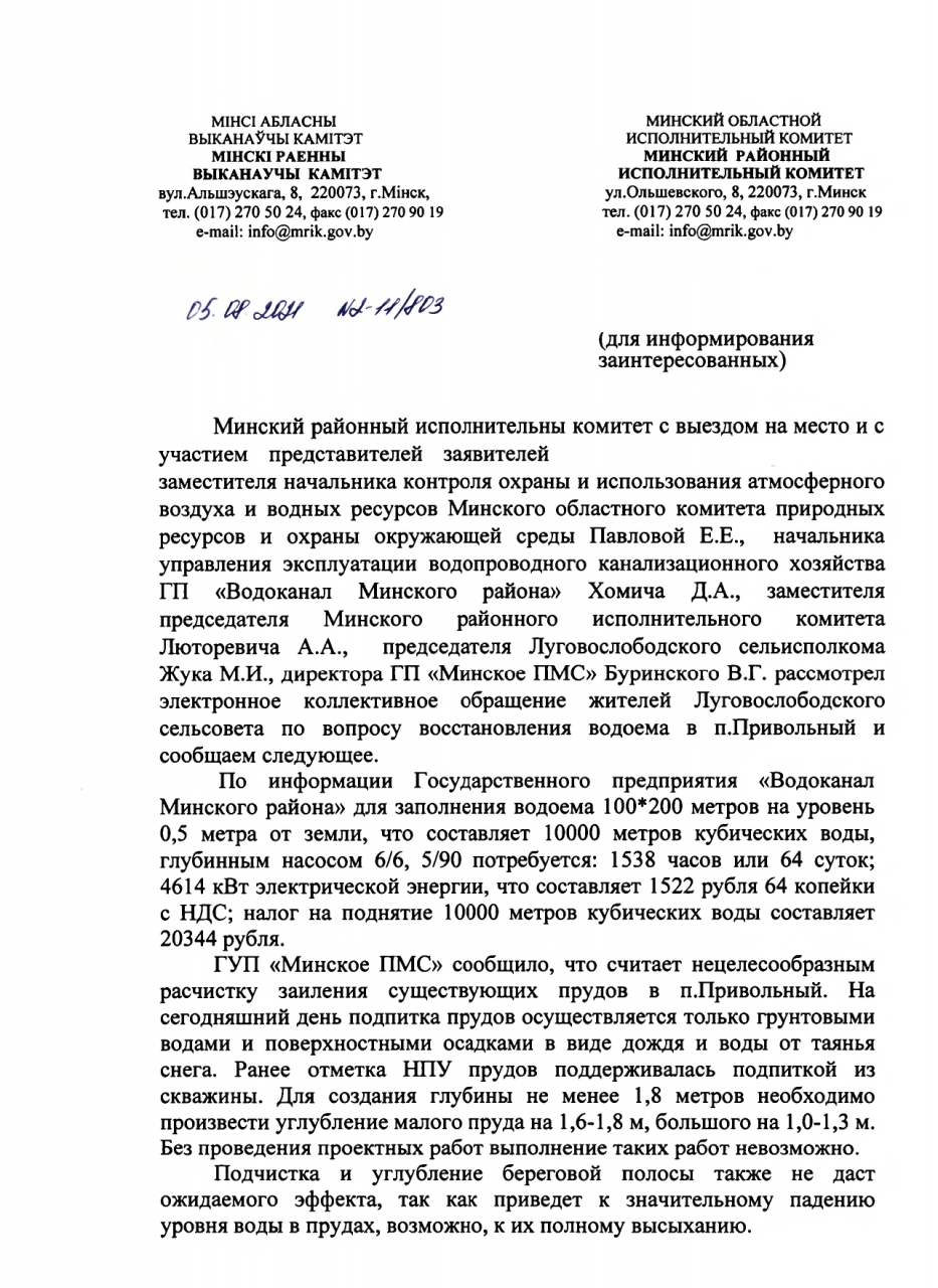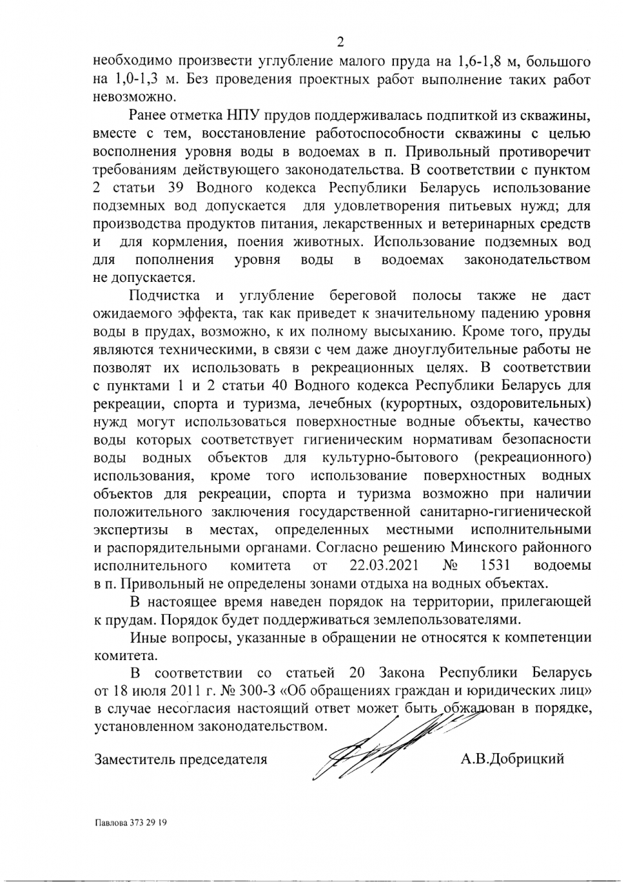 ГУП "Минское ПМС" считает нецелесообразным расчистку заиления существующих прудов в п.Привольный. Пруды являются техническими, в связи с чем даже дноуглубительные работы не позволяет использовать их в рекреационных целях. Восстановление работоспособности скважин с целью восполнения уровня воды в водоёмах в п.Привольный противоречит требованиям законодательства.