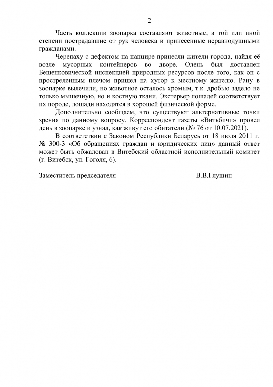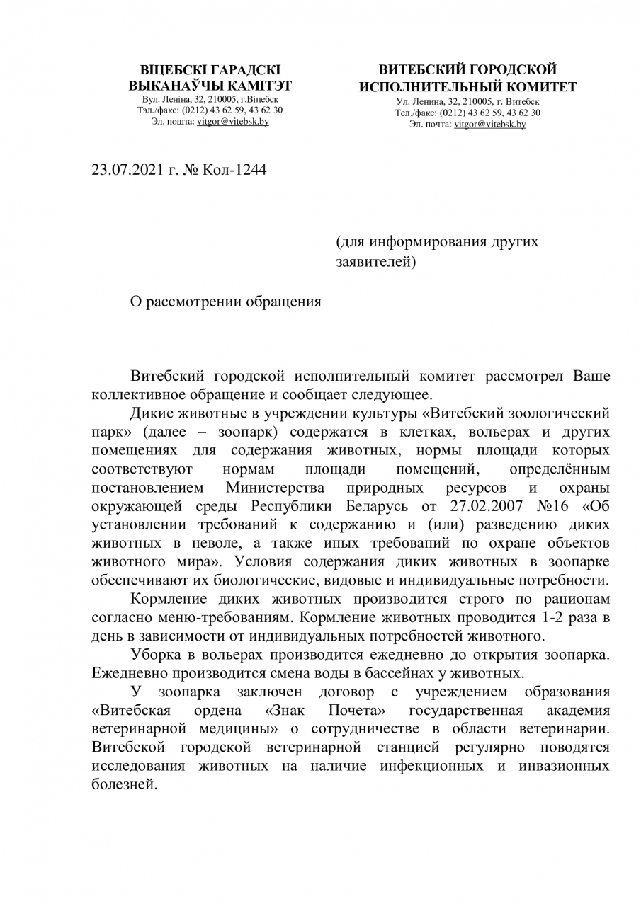 провести проверку по признакам несоблюдения должностными лицами Витебского зоопарка требований по содержанию диких животных в неволе и проведению ветеринарных мероприятий, установленных законодательством;
