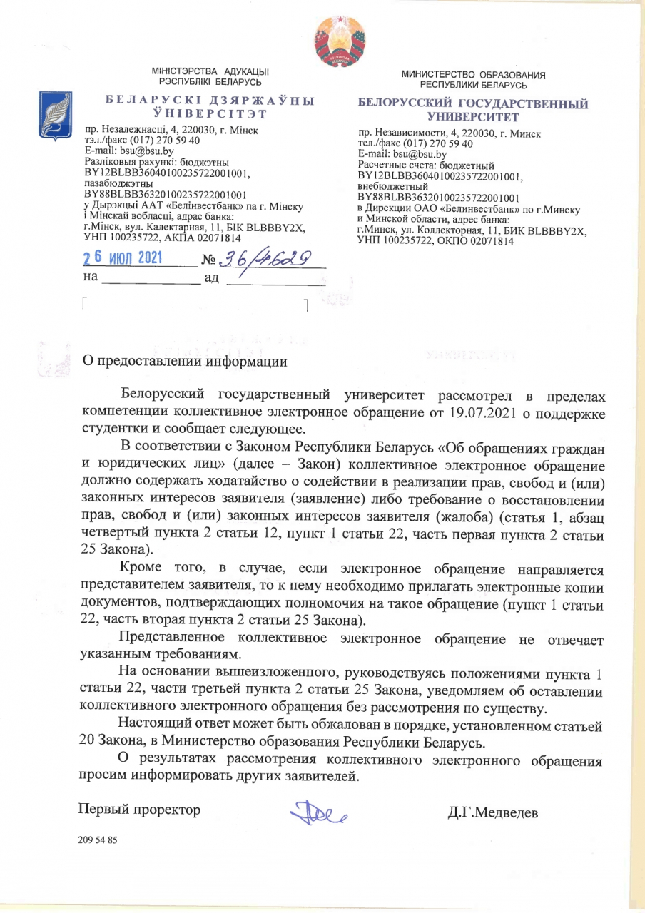 Во время рассмотрения дела судом, по нашим данным, Белорусский государственный университет не выступил в поддержку и защиту своей выпускницы.