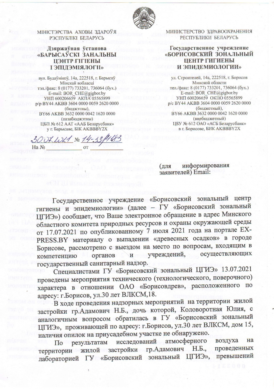 На сайте ОАО "Борисовдрев" информация о выбросе древесных опилок и пыли в воздух отсутствует. Нет указанной информации и на сайте Борисовского районного исполнительного комитета, а также на сайте Борисовского ЗЦГЭ. Из этого можно сделать вывод, что ОАО "Борисовдрев" не уведомляло в установленном Законом "О санитарно-эпидемиологическом благополучии населения" порядке органы и учреждения, осуществляющие государственный санитарный надзор, об произошедшей аварийной ситуации. Только благодаря публикации в СМИ, а также небезразличным гражданам общественность узнала об очередном выбросе древесных пыли и опилок.