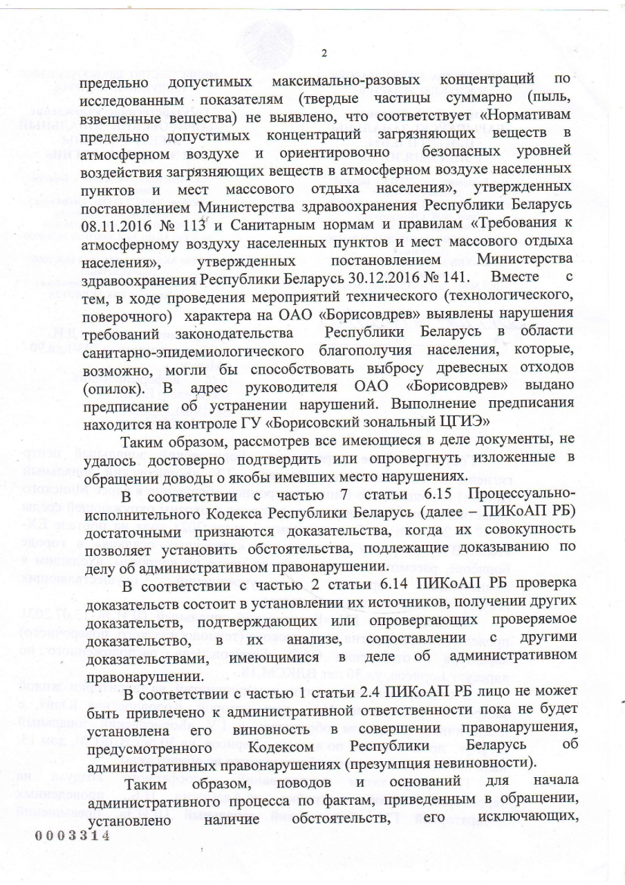 - начать административный процесс против ОАО «Борисовдрев», и привлечь общество за нарушение санитарных норм и правил, а также за нарушение технических требований или нормативов в области охраны окружающей среды – к административной ответственности согласно статьям 16.1 и 17.5 КоАП.