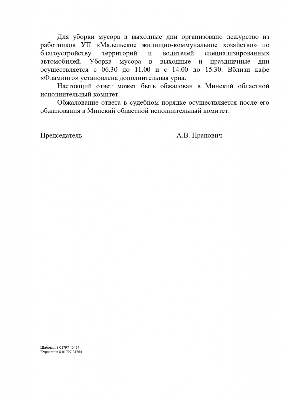 Для уборки мусора в выходные дни организовано дежурство из работников УП "Мядельское жилищно-коммунальное хозяйство" по благоустройству территорий и водителей специализированных автомобилей.