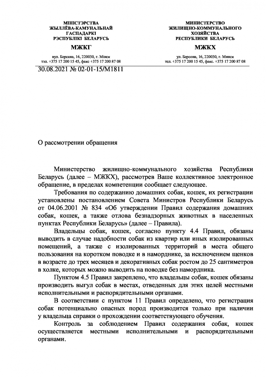 Учитывая необходимость совершенствования законодательства в сфере обращения с домашними собаками и кошками, актуализации нормативной правовой базы в этой области, гуманизации в обращении с бездомными собаками, Минжилкомхозом разработан проект постановления Совета Министров Республики Беларусь «О вопросах по обращению