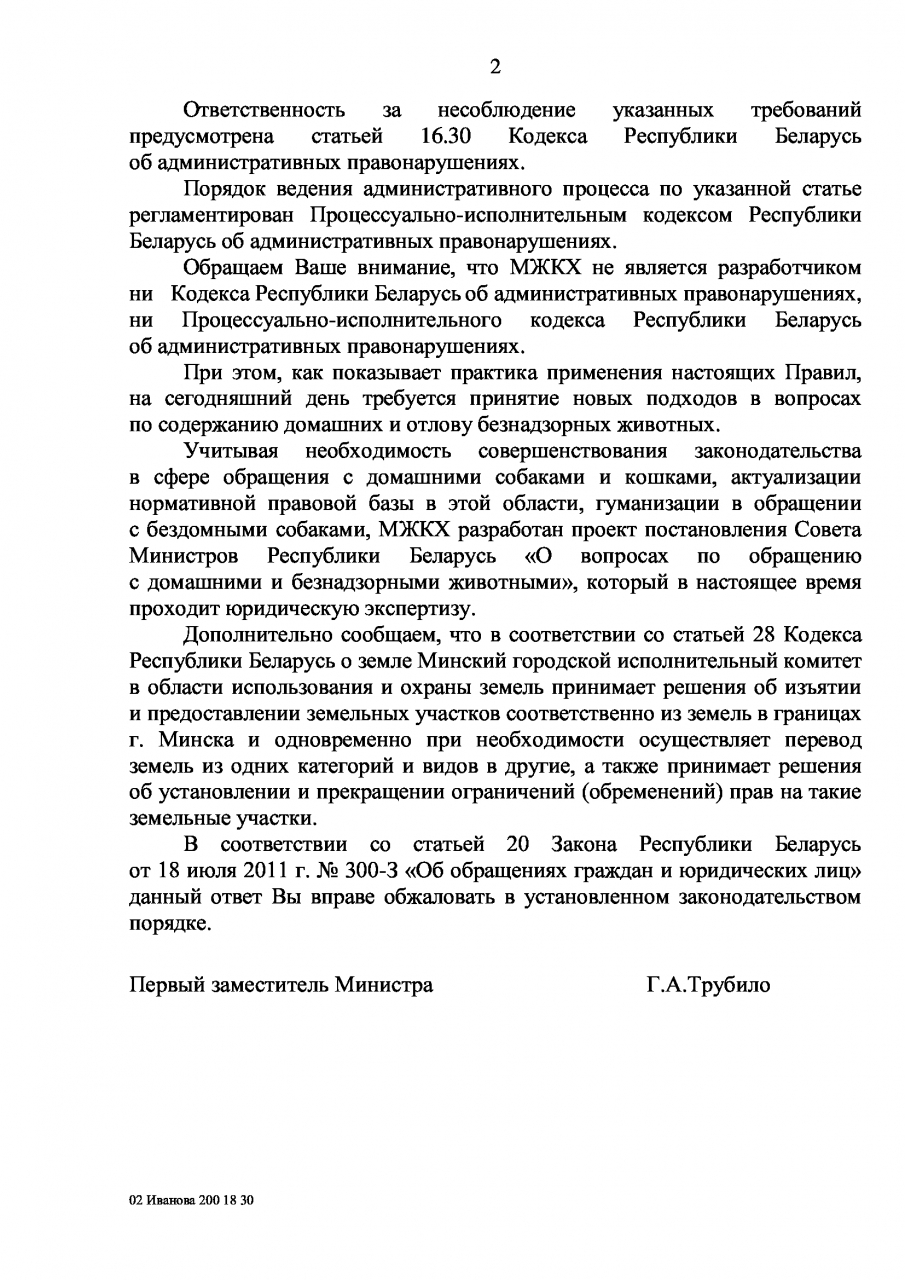 2. Назначить одну организацию ответственной за вопросы содержания и выгула домашних питомцев, наделив её необходимыми полномочиями, в том числе в части привлечения к решению возникших вопросов другие государственные органы, без "отписок" и перекладывания работы на заявителя.