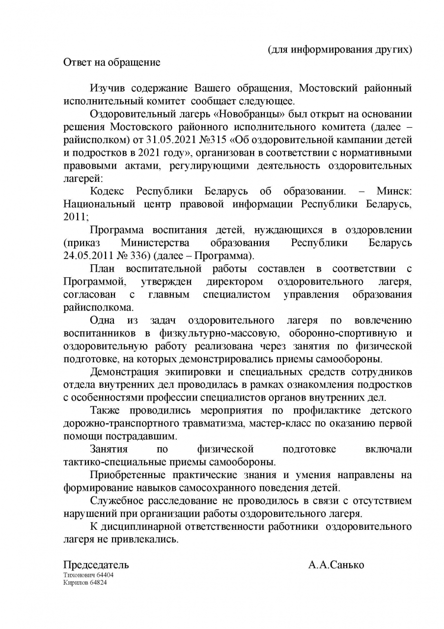 - привлечь к дисциплинарной ответственности заведующего лагерем "Новобранцы" - за противоречие организации воспитательной работы в нем Кодексу об образовании;