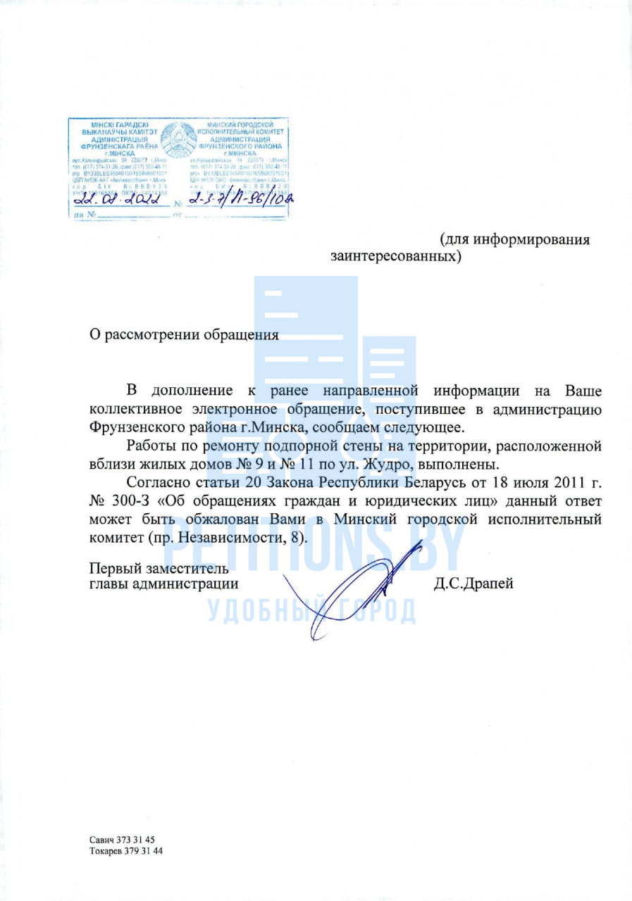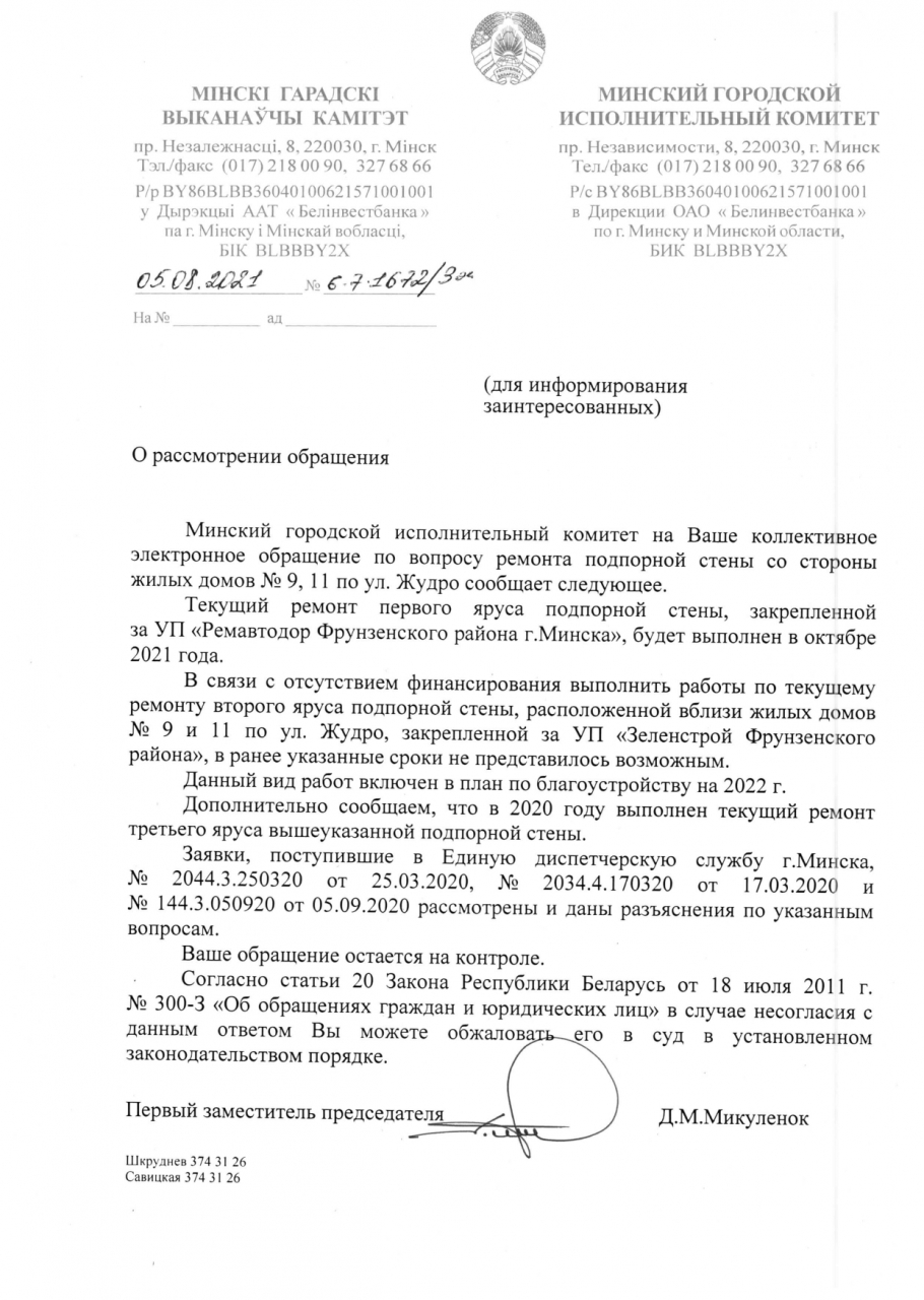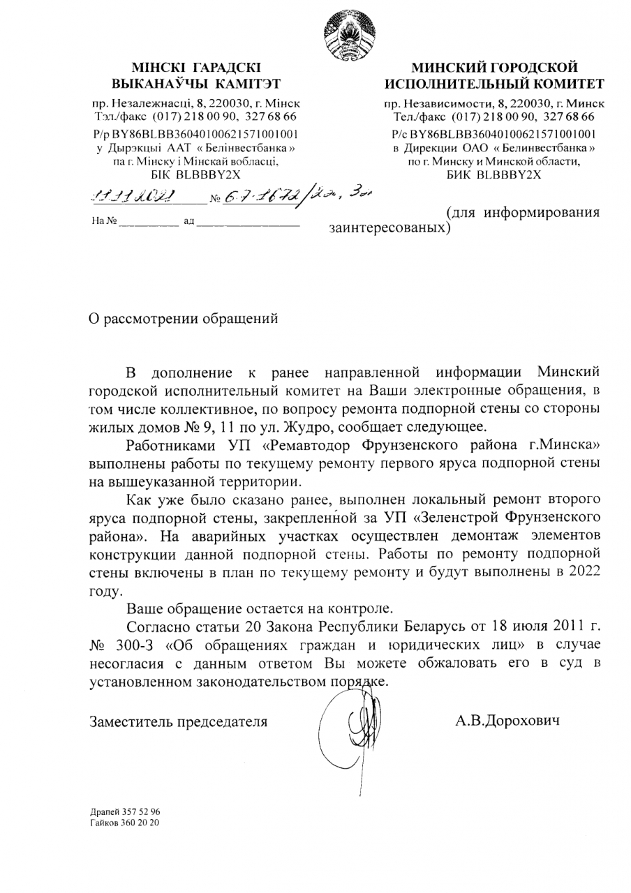 25 сентября 2020 г. получен ответ администрации Фрунзенского района г.Минска (копия прилагается) на электронное обращение граждан о ненадлежащем состояние подпорных стен за жилыми домами №№ 9, 11 на ул.Жудро.