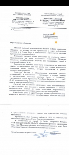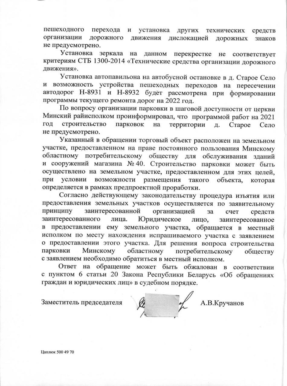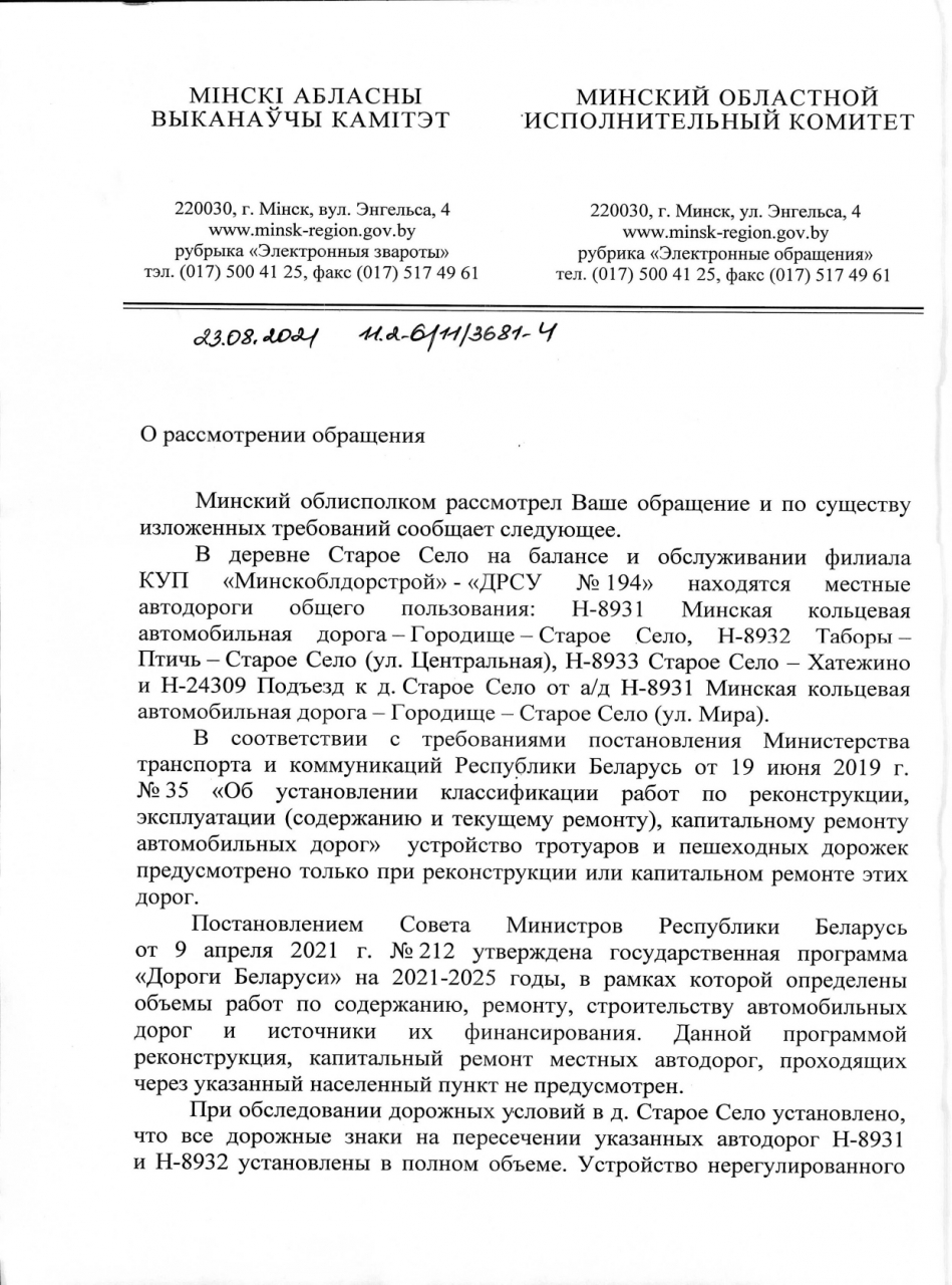 17.06.2021 получен ответ Минского райисполкома от 17.06.2021 №2-13/1, 2-12/1035/кл (копия прилагается) на электронное обращение граждан по аварийно-опасному перекрёстку в деревне Старое Село.