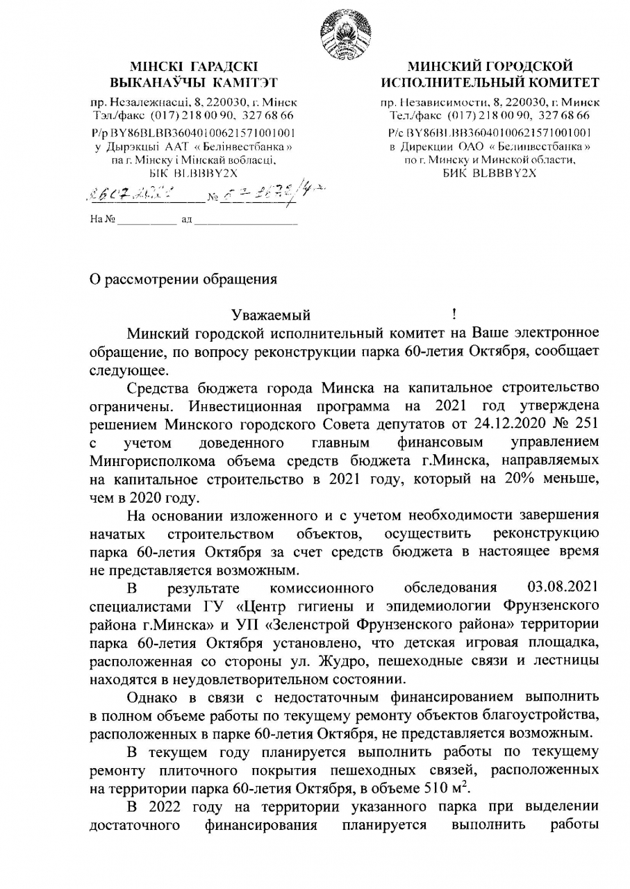 4. Просим предоставить информацию о внесении парка 60-летия Великого Октября в Инвестиционную программу г. Минска на 2021.